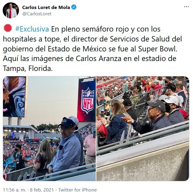 Por asistir al Super Bowl 2021, autoridades del Estado de México decidieron separar de su cargo al coordinador del Instituto de Salud del Estado de México (ISEM), Carlos Aranza Doniz, y a su asesor, José Fernando Gil García, ante la falta de sensibilidad de los funcionarios por acudir al evento deportivo masivo en Tampa, Florida.Lo anterior, luego de que el periodista Carlos Loret de Mola, difundió en su cuenta de Twitter imágenes donde aparece un hombre con rasgos similares a Carlos Aranza Doniz en el estadio en suelo estadounidense, por lo que autoridades mexiquenses iniciaron una investigación al respecto, que derivó en el cese del coordinador del ISEM.Autoridades de la Secretaría de Salud reiteraron que "la pandemia ocupa toda la atención de la estructura de Salud mexiquense, en todo momento y en todos los niveles, pues la salud de todos los mexicanos y de todos los mexiquenses es la única prioridad".El Estado de México permanece en semáforo rojo y en máxima alerta por contagios de Covid-19 y este 7 de febrero registró 145 mil casos positivos de Covid-19 y una ocupación hospitalaria del 77%, donde personal médico y especialmente directivos trabajan de forma continua, prácticamente sin días de asueto.De acuerdo a la compañía Ticketmaster, la elegida por la NFL para hacer la venta de las entradas, un día antes del Super Bowl había boletos con precios que oscilaban entre los 5 mil 200 dólares (unos 104 mil 515 pesos) en los asientos más económicos hasta casi los 23 mil dólares (462 mil 279 pesos ) por las mejores posiciones en el estadio.IM