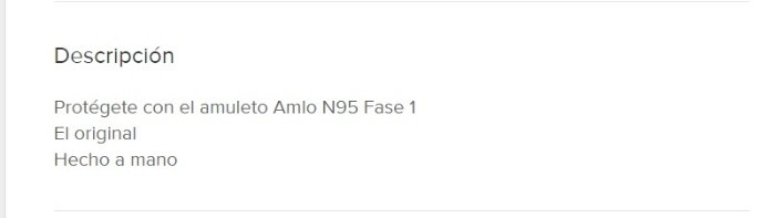 Mientras AMLO continúa, en lo que se asume es una exitosa recuperación tras dar positivo a COVID-19 el domingo pasado, y la pandemia de coronavirus ya hizo que México ocupara el tercer lugar a nivel mundial en muertes por la enfermedad este jueves, la versión artesanal de la “protección” sugerida por el mandatario ya se encuentra a la venta en un sitio de ventas por Internet.Se trata del famoso “detente” que el Presidente Andrés Manuel López Obrador mostró alguna vez en su “mañanera” como medida preventiva ante el coronavirus, que junto a otros amuletos y a la honestidad, imaginó efectivos para evitar el contagio."¡DETENTE! Pandemia, inflación, prianista, conservador, adversario, chayotero, neoliberalista... Que el tigre del pueblo bueno y sabio está conmigo", se lee en el reverso del amuleto, mientras que el anverso muestra una caricatura de AMLO.Ofrecido como “Amuleto N95 Amlo Escudo Protector” en Mercado Libre, el artículo tiene un costo de 350 pesos por unidad y está hecho a mano, según la publicación. También está disponible por mayoreo en paquetes que van hasta los 30 mil pesos con 200 unidades."Protégete con el amuleto Amlo N95 Fase 1. El original. Hecho a mano", se lee en la descripción del producto.Sobresalen, como era de esperarse, los comentarios hechos en la sección de preguntas del artículo en el sitio de ventas por Internet, entre los que se ofrecen cantidades “a tratar” por el amuleto y entre los que “ponen en duda” la “efectividad” del producto: “No funciona. Ya le dio a AMLO”, reseña un usuario.La tienda del vendedor, de quien el sitio indica está en Guadalajara, ofrece también diversos artículos personalizados para regalar y para decoración, aunque sin duda, este amuleto podría ser uno de los más populares.