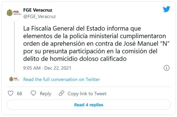La Fiscalía General de Veracruz informó este miércoles que fue arrestado por presunto homicidio doloso José Manuel del Río, exdiputado y actual secretario técnico de la Junta de Coordinación Política (Jucopo) del Senado."La Fiscalía General del Estado informa que elementos de la Policía Ministerial cumplimentaron orden de aprehensión en contra de José Manuel N por su presunta participación en la comisión del delito de homicidio doloso calificado", anunció la Fiscalía en un comunicado.La institución detalló que el homicidio tuvo lugar el pasado 4 de junio y anunció que Del Río "será presentado en audiencia inicial ante el juez de proceso y procedimiento oral para que defina su situación jurídica".Según medios locales, a Del Río se le relaciona con el asesinato del candidato a la alcaldía del municipio Cazones de Herrera por el partido Movimiento Ciudadano, René Tovar.Por ese delito también fue arrestado el alcalde electo del municipio, Omar Ramírez.En un mensaje en video, el presidente de la Jucopo, Ricardo Monreal, denunció una "persecución política" contra Del Río, uno de sus asesores, perpetrada por las autoridades veracruzanas."Se trata de una detención alejada del principio de legalidad, maquinada, inventada, construida artificialmente. Se demostrará que es un abuso de poder", dijo.JM