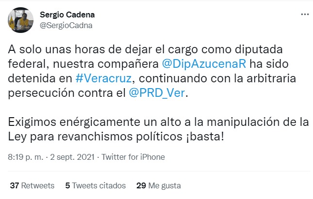 La ex diputada federal del Partido de la Revolución Democrática (PRD) Azucena Rodríguez fue detenida, junto con una persona más, acusada del presunto homicidio de su esposo.A Rodríguez, quien había dejado el cargo de legisladora hace tan solo tres días, se le acusa de estar detrás del crimen de su marido, Nicanor Martínez, quien fue candidato suplente a la alcaldía de Tihuatlán, en estado de Veracruz.La Fiscalía General del Estado de Veracruz informó que la orden de arresto contra Norma Azucena "N" y de Ethel Margarita "N" fue por el delito de homicidio doloso calificado presuntamente en contra del excandidato, y por tentativa de homicidio doloso calificado en agravio de dos víctimas más, de identidades reservadas.La víctima mortal, quien pertenecía al partido de Morena, fue asesinado a tiros el pasado 1 de julio en el norte de Veracruz, un estado con altos niveles de criminalidad.A la detenida le fue dictada prisión preventiva oficiosa por el lapso de un año, tiempo en el cual deberá llevarse a cabo el juicio para determinar si es inocente o culpable de los cargos que las autoridades ministeriales le imputan.Durante ese periodo permanecerá recluida en el penal de Pacho Viejo, una penitenciaria donde son recluidos generalmente exfuncionarios y políticos acusados de distintos delitos.La detención fue catalogada este viernes por su partido, en una rueda de prensa, como una "persecución política" del Estado.El dirigente del PRD en Veracruz, Sergio Cadena, aseguró que la detención de la exdiputada federal es un acto de revanchismo por parte del actual Gobierno de Veracruz, del cual ha sido una dura crítica.En conferencia de prensa, dijo que resulta sospechoso que la política haya sido detenida apenas unos días después de haber terminado su cargo.Dijo que no están en contra de que se esclarezca el crimen, pero no están a favor de que se fabriquen culpables, ya que afirmó que en este caso no hay más elementos que el propio señalamiento de las autoridades.Si te interesó esta noticia y quieres saber más, entonces descarga y descubre INFORMAPlus, la aplicación digital de EL INFORMADOR, en donde tenemos contenidos exclusivos, seleccionados por nuestros editores, para darles una experiencia más completa a los lectores.Descarga la aplicación y pruébala GRATIS por treinta días.Para iOS: https://apple.co/35jaVgbPara Android: https://bit.ly/3gwVSEVSi eres suscriptor de EL INFORMADOR tu acceso está incluido, solicítalo al 33 3678-7777GC