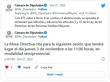 Los diputados federales se regalaron un puente de siete días, que les permitirá disfrutar de los festejos por el Día de Muertos.Al término de la sesión de este jueves, la presidencia de la Mesa Directiva ordenó el turno a comisiones de las iniciativas y las proposiciones inscritas en el orden del día, y citó a sesión hasta el próximo jueves 3 de noviembre.Al mismo tiempo se recibió en la cámara baja un oficio firmado por Alejandro Armenta Mier, presidente de la Cámara de Senadores, para informar que ese órgano legislativo hará lo propio y "dejará de sesionar por más de tres días en el lapso que comprenden los días jueves 27 de octubre de 2022 al miércoles 2 de noviembre del mismo año".JM