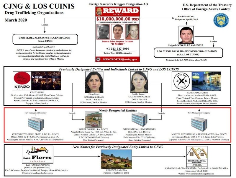 El Departamento del Tesoro de Estados Unidos anunció hoy sanciones contra cuatro compañías de Jalisco y Colima vinculadas con el Cártel Nueva Generación y con el de los Cuinis.La Oficina de Control de Bienes Extranjeros (OFAC) del Departemento del Tesoro fichó a las empresas en una acción paralela al operativo Proyecto Python anunciado hoy por la Administración para el Control de Drogas (DEA), que derivó en la detención de más de 700 miembros del CNG en varios puntos de Estados Unidos. Las empresas sancionadas son International Investments Holding, registrada en Guadalajara, y la gasolinera GBJ de Colima, así como Máster Reposterías y Restaurantes, que adminstra Bake and Kitchen en Zapopan, Jalisco; y Corporativo Sushi Provi, que adminstra Kenzo Sushi en Guadalajara.Así, quedan bloqueadas todas las propiedades y derechos de propiedad que esas empresas tengan en Estados Unidos.La sanción de hoy se suma a otras 10 acciones de la OFAC contra los cárteles Nueva Generación y de los Cuinis, fichados en 2015 junto a sus líderes (Ruben Oseguera Cervantes, el “Mencho” y Abigael González Valencia) por su papel en el narcotráfico internacional. IM