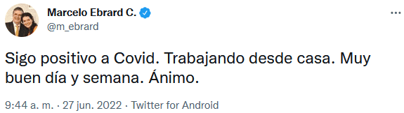 El canciller Marcelo Ebrard informó que seis días después de su contagio sigue siendo positivo a COVID-19, por lo que continuará trabajando en casa."Sigo positivo a Covid. Trabajando desde casa. Muy buen día y semana. Ánimo", escribió en su cuenta de Twitter.El pasado lunes, el secretario de Relaciones Exteriores anunció que dio positivo a COVID-19, con síntomas de un catarro.Debido a su contagio, Marcelo Ebrard no pudo asistir al evento por la unidad en Morena realizado este domingo en Coahuila, a donde acudieron las "corcholatas" del partido: la jefa de gobierno de la Ciudad de México, Claudia Sheinbaum, el secretario de Gobernación, Adán Augusto López y el senador Ricardo Monreal.OA