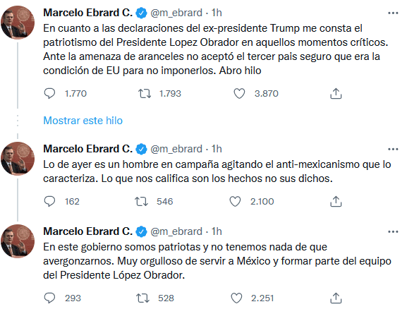 El secretario de Relaciones Exteriores (SRE), Marcelo Ebrard, destacó el actuar del Presidente Andrés Manuel López Obrador ante "momentos críticos" y rechazó los dichos del expresidente de Estados Unidos, Donald Trump, quien aseguró que "dobló" al Gobierno de México en materia migratoria.Luego de que este domingo el republicano resaltó que en su administración se "doblegó" al gobierno de López Obrador para que se colocaran 28 mil elementos de la Guardia Nacional en la frontera sur para frenar la migración, el canciller enumeró acciones del primer mandatario en los que negó un trato inferior hacia México.En su cuenta de Twitter, el titular de la SRE puso de ejemplo que durante la presión del gobierno de Donald Trump sobre la imposición de aranceles, López Obrador rechazó hacer de México un "tercer país seguro", condición que solicitó Estados Unidos para detener el incremento en los impuestos.Aseguró que gracias a la "entereza" del jefe del Ejecutivo federal fue posible excluir el capítulo de integración energética en el Tratado entre México, Estados Unidos y Canadá, que ya se había negociado con el equipo del gobierno saliente, y que "de haberse aceptado sería imposible la autonomía que hoy tenemos".De no ser por el Presidente López Obrador, México tampoco habría podido diferir en su posición respecto a la relación entre Venezuela y Estados Unidos, y no se hubiese podido rescatar a Evo Morales, expresidente de Bolivia, cuando fue exiliado de su país, dijo Ebrard.Al igual que lo hizo el Presidente López Obrador durante su conferencia "mañanera", Marcelo Ebrard recordó que en Estados Unidos se lleva a cabo un proceso de campañas electorales, lo que incitó a Donald Trump a realizar dichas declaraciones."Lo de ayer es un hombre en campaña agitando el anti-mexicanismo que lo caracteriza. Lo que nos califica son los hechos no sus dichos", escribió.En este sentido, manifestó que el gobierno de López Obrador es un patriota, del que no tiene nada de que avergonzarse."Muy orgulloso de servir a México y formar parte del equipo del Presidente López Obrador", finalizó.OA