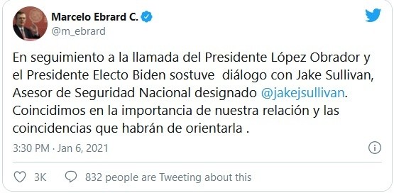 El titular de la Secretaría de Relaciones Exteriores (SRE), Marcelo Ebrard Casaubón, sostuvo un diálogo este miércoles por la tarde con Jake Sullivan, asesor de Seguridad Nacional del presidente electo de Estados Unidos, Joe Biden. El tema principal de la conversación habría sido la política migratoria.A través de su cuenta de Twitter, Ebrard indicó que ambos funcionarios coincidieron en la importancia de la relación bilateral entre México y Estados Unidos y que el diálogo se llevó a cabo en seguimiento a la llamada telefónica entre el Presidente Andrés Manuel López Obrador (AMLO) y Joe Biden.En ese momento, el tema central de la conversación fue el migratorio."En seguimiento a la llamada del presidente López Obrador y el presidente electo Biden sostuve diálogo con Jake Sullivan, Asesor de Seguridad Nacional designado @jakejsullivan. Coincidimos en la importancia de nuestra relación y las coincidencias que habrán de orientarla", dijo.El canciller Ebrard ha anunciado que a partir de la toma de posesión de Biden como presidente constitucional de Estados Unidos, el próximo 20 de enero, la relación con ese país entrará a una nueva etapa.JM