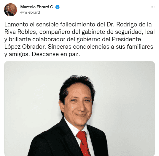 El canciller Marcelo Ebrard reportó la muerte del doctor Rodrigo de la Riva Robles, integrante del gabinete de seguridad del gobierno del presidente Andrés Manuel López Obrador. El secretario de Relaciones Exteriores, Marcelo Ebrard, envió sus condolencias a familiares y amigos por el sensible fallecimiento del funcionario. De la Riva Robles estudió la licenciatura en Derecho en la Escuela Nacional de Estudios Profesionales- Acatlán, de la Universidad Nacional Autónoma de México y era Maestro en Ciencias Penales por el Instituto de Ciencias Jurídicas de Estudios Superiores y doctorado en Ciencias Penales por la Universidad Tepantlato.Fue coordinador general de Investigación Estratégica en la Fiscalía General de la capital y Subprocurador de Averiguaciones Previas Centrales en la Procuraduría General de Justicia de la Ciudad de México.Participó en el diseño del Programa de Gobierno de Claudia Sheinbaum Pardo y fue secretario particular en la Secretaría de Desarrollo Social de la Ciudad de México de diciembre de 2012 a julio de 2015. También fungió como director de Área y Coordinador Regional de la Zona Occidente de 2009 a 2011 en la Procuraduría General de la República; subdirector y encargado de la Dirección General de Amparo de la PGR de 2005 a 2009. Fue coordinador Jurídico del DIF en Tlalnepantla, Estado de México de 2003 a 2004.En la Secretaría de Salud fue jefe de departamento en la Dirección General de Asuntos Jurídicos y en la Contraloría Interna de 1995 a 1996. En la Secretaría de Gobernación fue secretario auxiliar de 1994 a 1995 y de 1993 a 1994 fue asesor en la oficina del titular de la Procuraduría General de la República.Era profesor de la Universidad Nacional Autónoma de México, Facultad de Estudios Superiores Acatlán desde 1996.
