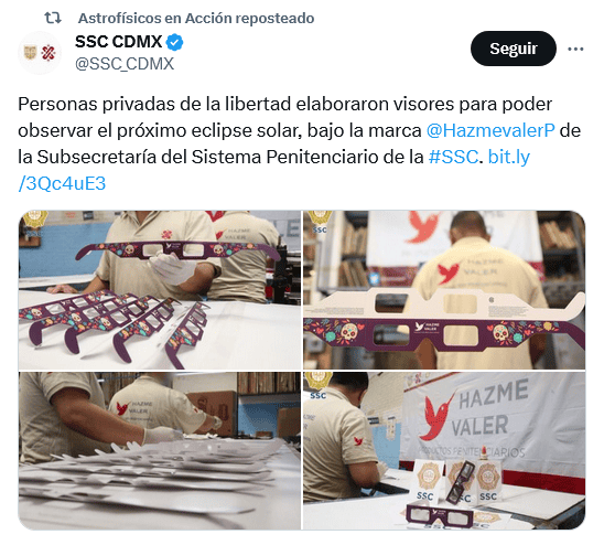 Los habitantes de la Ciudad de México podrán apreciar este sábado 14 de octubre el eclipse solar anular que en la Península de Yucatán alcanzará una vista de hasta el 90%. Los especialistas indican que para apreciarlo deben seguir varias recomendaciones para evitar algún daño a la vista debido a la radiación que produce este fenómeno.Entre las sugerencias se encuentra el uso de visores o lentes especiales, los cuales deben cumplir con los requisitos necesarios establecidos en la norma ISO 12312-2, para filtros Eclipse Solar, además de maquilarse bajo altos estándares de calidad e higiene. Esto nos lleva a hablar de los que se elaboran y comercializarán bajo la marca "Hazme Valer", fabricados por personas privadas de la libertad del Reclusorio Preventivo Varonil Oriente, ubicado en la alcaldía Iztapalapa.Estos lentes podrán ser adquiridos, a un precio de 100 pesos, en las tiendas oficial de Hazme Valer de la Subsecretaría del Sistema Penitenciario de la CDMX, ubicadas en el Museo del Policía de la Ciudad de México y en la Tienda Institucional de la Calzada San Antonio Abad número 130, de la colonia Tránsito, alcaldía Cuauhtémoc.Para ser elaborados estos visores, se contó con capacitación del maestro en Ciencias Zeus Alberto Valtierra Quintal, profesor de la Facultad de Ciencias de la UNAM y astrónomo.OF