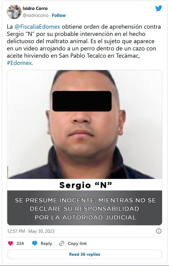La Fiscalía General de Justicia del Estado de México obtuvo una orden de aprehensión contra Sergio "N", quien está acusado de lanzar a un perrito a un cazo con aceite hirviendo en Tecámac.Un juez del Tribunal Superior de Justicia del Edomex liberó la orden de detención por su probable intervención en el maltrato animal. Al momento buscan al responsable de esta agresión hacia el perro. La Fiscalía local, con apoyo de la Comisión Nacional Antihomicidio (CONAHO) de la Secretaría de Seguridad y Protección Ciudadana federal, de la Secretaría de Seguridad Ciudadana CDMX y de la Secretaría de Seguridad Edomex, lograron identificar a Sergio "N" como probable responsable del hecho delictuoso de maltrato animal, por lo que se obtuvo la orden de aprehensión correspondiente.En redes sociales ya han comenzado a circular supuestos retratos del sospechoso, así como su posible domicilio, por lo que es probable que en poco tiempo éste sea arrestado. JM
