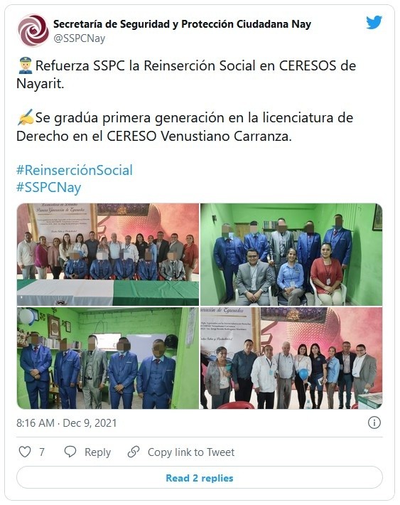 El pasado 9 de diciembre, cinco reos del Centro de Reinserción Social Venustiano Carranza, en Tepic, Nayarit, se graduaron como abogados, así lo dio a conocer la Secretaría de Seguridad y Protección Ciudadana (SSPC) estatal a través de sus redes sociales.En un comunicado, la SSPC detalló que los presos terminaron la Licenciatura de Derecho y se convirtieron así en la primera generación de profesionales que estudiaron en el penal.Resaltan que este logro permitirá una reinserción más sencilla de los reos al mercado laboral, además de brindar un mensaje de responsabilidad social e inclusión.Para finalizar, informan que esta graduación se logró gracias a la coordinación de la SSPC con el Instituto de Estudios Tecnológicos y Superiores Matatipac.JM