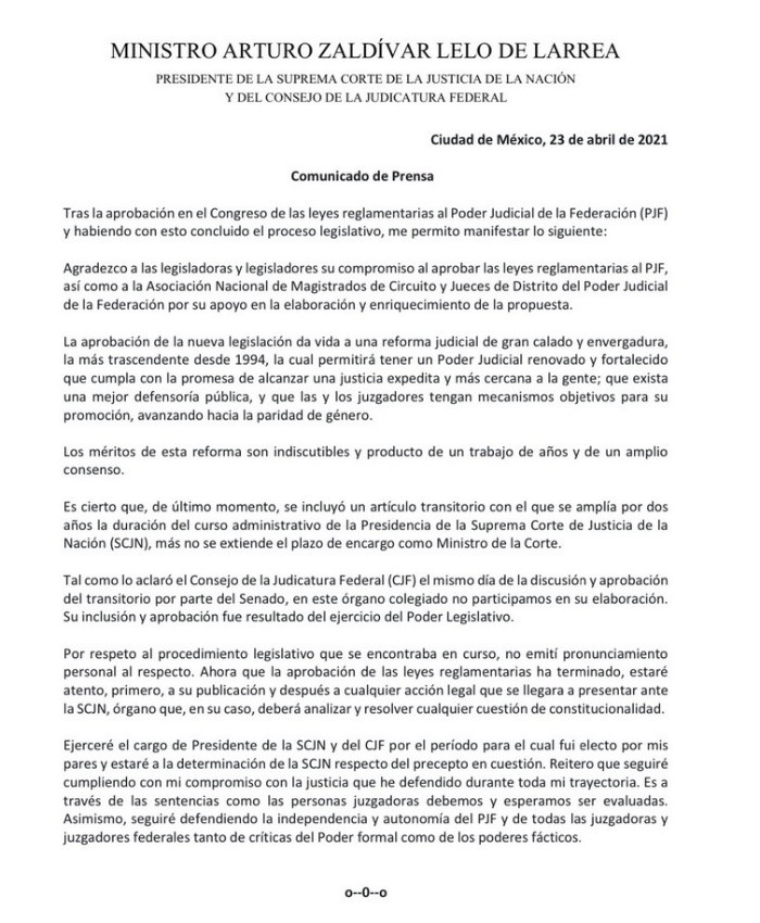 Luego de que la Cámara de Diputados aprobó en lo general y particular la minuta de la Ley Orgánica del Poder Judicial que amplía la presidencia de Arturo Zaldívar en la Suprema Corte de Justicia de la Nación (SCJN), el ministro compartió su posición en redes sociales.Zaldívar agradeció a legisladores y legisladoras por su compromiso al aprobar las leyes reglamentarias al Poder Judicial, así como a la Asociación Nacional de Magistrados de Circuito y Jueces de Distrito del Poder Judicial de la Federación por su apoyo en la elaboración y enriquecimiento de la propuesta.Añadió que "de último momento" se incluyó un artículo transitorio con el que se amplía dos años su mandato al frente de la SCJN, "más no se extiende el plazo de encargo como ministro de la Corte"."Tal como lo aclaró el Consejo de la Judicatura Federal (CJF), el mismo día de la discusión y aprobación del transitorio por parte del Senado, en este órgano colegiado no participamos en su elaboración. Su inclusión y aprobación fue resultado del ejercicio del Poder Legislativo"."Por respeto al procedimiento legislativo que se encontraba en curso, no emití pronunciamiento personal al respecto. Ahora que la aprobación de las leyes reglamentarias ha terminado, estaré atento, primero, a su publicación y después a cualquier acción legal que se llegara presentar ante la SCJN, órgano que, en su caso, deberá analizar y resolver, cualquier cuestión de constitucionalidad"."Ejerceré el cargo de presidente de la SCJN y del PJF por el periodo para el cual fui electo por mis pares y estaré a la determinación de la SCJN respecto del precepto en cuestión. Reitero que seguiré cumpliendo con mi compromiso con la justicia que he defendido durante toda mi trayectoria"."Es a través de las sentencias como las personas juzgadoras debemos y esperamos ser evaluadas, Asimismo seguiré defendiendo la independencia y autonomía del PJF y de todas las juzgadoras y juzgadores federales tanto de críticas del Poder formal como de los poderes fácticos", expresó Zaldívar."La aprobación de la nueva legislación da vida a una reforma judicial de gran calado y envergadura, la más trascendente desde 1994, la cual permitirá tener un Poder Judicial renovado y fortalecido que cumpla con la promesa de alcanzar una justicia expedita y más cercana a la gente; que exista una mejor defensoría pública, y que las y los juzgadores tengan mecanismos objetivos para su promoción, avanzando hacia la paridad de género", refirió el ministro presidente de la Corte.Destacó que los méritos de esta reforma son indiscutibles "y producto del trabajo de años y de un amplio consenso".OA