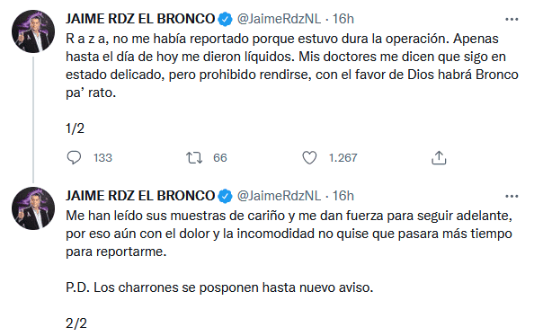 "Sigo en estado delicado, pero prohibido rendirse", señaló Jaime Rodríguez Calderón "El Bronco", quien usó sus redes sociales para informar sobre su estado de salud tras ser intervenido quirúrgicamente la mañana del pasado viernes en el Hospital Universitario.El pasado viernes, el exgobernador de Nuevo León fue operado para retirarle un tramo del intestino, afectado por dos tumores de uno y cuatro centímetros que le habían sido extirpados y que tras diversos estudios, se detectó que en el mayor de ellos había células precancerígenas."Raza, no me había reportado porque estuvo dura la operación. Apenas hasta el día de hoy me dieron líquidos. Mis doctores me dicen que sigo en estado delicado, pero prohibido rendirse, con el favor de Dios habrá Bronco pa’ rato"."Me han leído sus muestras de cariño y me dan fuerza para seguir adelante, por eso aún con el dolor y la incomodidad no quise que pasara más tiempo para reportarme. P.D. Los charrones se posponen hasta nuevo aviso"."El Bronco" fue detenido e ingresado en el penal 2 de Apodaca el pasado 15 de marzo, acusado por delitos electorales presuntamente cometidos durante su campaña presidencial como candidato independiente en 2018, y poco después empezó a sufrir complicaciones en su estado de salud relacionado con una diverticulitis y sangrado intestinal.Su amigo y médico de cabecera, Manuel de la O Cavazos, quien ocupó durante la administración de Rodríguez Calderón la titularidad de la Secretaría Estatal de Salud, afirmó tras visitarlo en el penal 2 de Apodaca, que el ex gobernador estaba en riesgo de morir porque presentaba un alto grado de anemia.OA