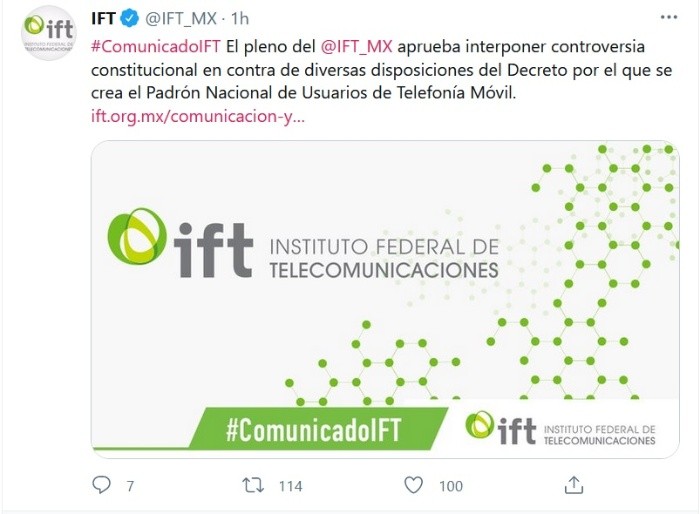 El Pleno del Instituto Federal de Telecomunicaciones (IFT) aprobó este miércoles presentar una controversia constitucional en contra del Padrón Nacional de Usuarios de Telefonía Móvil."Con este recurso legal, el IFT busca garantizar su autonomía presupuestal, así como un ejercicio eficaz y oportuno de las facultades y fines que constitucionalmente están encomendados a este instituto, a través de los mecanismos previstos por nuestra Constitución y con pleno respeto a las facultades de los demás Órganos y Poderes de la Unión", subraya el regulador en un comunicado.Este padrón se establece como parte de las reformas a la Ley Federal de Telecomunicaciones y Radiodifusión, publicadas el 16 de abril de 2021.La reforma indica que el Instituto instalará, operará, regulará y mantendrá el padrón de usuarios móviles "con cargo a su presupuesto y realizará las acciones necesarias para solicitar a los concesionarios de telecomunicaciones y, en su caso, a los autorizados, la cancelación en forma inmediata de aquellas líneas de telefonía móvil, que no hayan sido identificadas o registradas por los usuarios o clientes".Sin embargo, ni en la planeación presupuestal ni en el presupuesto aprobado por la Cámara de Diputados para el ejercicio fiscal 2021, hay recursos asignados para poner en marcha el registro, al ser este último una obligación reciente de gasto generada durante el ejercicio en marcha, detalla el regulador.El IFT no cuenta con recursos para el padrón, por lo que "el Pleno consideró que no existe justificación para que el legislador determine que el IFT deba realizar las acciones necesarias para que las erogaciones que se generen con motivo de instalar, operar, regular y mantener dicho padrón, se hagan con cargo a su presupuesto aprobado en el presente ejercicio fiscal y subsecuentes", se lee en un comunicado.JM