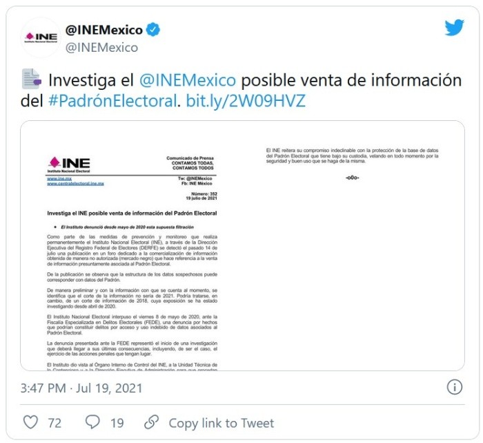 El Instituto Nacional Electoral (INE) investiga la posible venta ilegal del padrón electoral, que contiene datos sensibles de casi 95 millones de mexicanos.El INE informó que detectó el pasado 14 de julio una publicación en un foro dedicado a la comercialización de información obtenida de manera no autorizada en el "mercado negro", que hace referencia a la venta de información presuntamente asociada al Padrón Electoral.El organismo autónomo informó que en dicha publicación se observa que la estructura de los datos sospechosos puede corresponder con datos del padrón electoral de 2018."De manera preliminar y con la información con que se cuenta al momento, se identifica que el corte de la información no sería de 2021. Podría tratarse, en cambio, de un corte de información de 2018, cuya exposición se ha estado investigando desde abril de 2020".El INE recordó que el 8 de mayo de 2020 interpuso ante la Fiscalía Especializada en Delitos Electorales (FEDE), una denuncia por hechos que podrían constituir delitos por acceso y uso indebido de datos asociados al Padrón Electoral.Subrayó que "la denuncia presentada ante la FEDE representó el inicio de una investigación que deberá llegar a sus últimas consecuencias, incluyendo, de ser el caso, el ejercicio de las acciones penales que tengan lugar".En aquella ocasión se dio vista al Órgano Interno de Control del INE, a la Unidad Técnica de lo Contencioso y a la Dirección Ejecutiva de Administración para que procedan conforme a sus atribuciones, investiguen y, en su caso, "se finque responsabilidad administrativa, electoral o laboral, respectivamente".El INE reiteró su compromiso "indeclinable" con la protección de la base de datos del Padrón Electoral que tiene bajo su custodia, "velando en todo momento por la seguridad y buen uso que se haga de la misma".El INE aplicó una multa de más de 84 millones de pesos al PRI por ofrecer en dos mil pesos el padrón electoral 2015 en la plataforma de la empresa Mercado Libre.JM