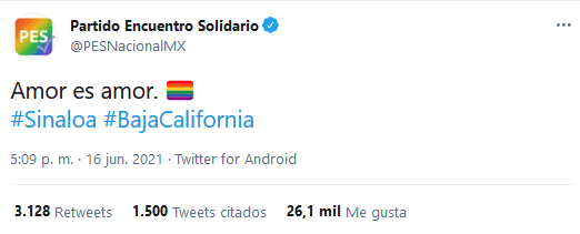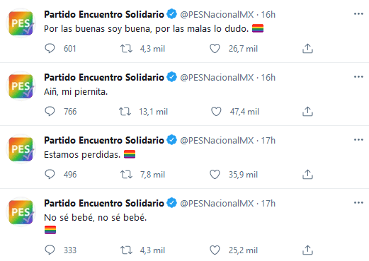 El Partido Encuentro Solidario (PES) de México, informó este jueves que denunciará a su gestor de redes sociales, ya que la tarde de ayer miércoles se emitieron en Twitter y Facebook mensajes en favor del colectivo LGBT y el matrimonio igualitario."Amor es amor", se escribió en la tarde del miércoles en el Twitter del PES acompañado de una bandera arcoíris y las etiquetas #BajaCalifornia y #Sinaloa, estados donde esta semana se aprobó el matrimonio para personas del mismo sexo.Este mensaje en pro del colectivo lésbico, gay, bisexual y transexual (LGBT) choca con la conservadora frase del 2 de junio publicada en la misma página del PES: "Compromiso por la vida. Es un derecho fundamental, inalienable, e indescriptible y debe ser protegido desde el momento de la concepción hasta la muerte natural no inducida".Durante horas, se publicaron en esta página y se retuitearon miles de veces mensajes en favor del colectivo LGBT o directamente chistosos, como "Estamos perdidas" o "Por las buenas soy buena, por las malas lo dudo"."Tendremos más 'likes' que votos, por un México para todas y todos", dijo el PES "hackeado" en sus últimos mensajes, antes de cambiar su logotipo y añadirle los colores del arcoíris.Además, algunos mensajes apuntaron a que el partido debe "meses" de sueldo a los gestores de sus redes y aseguraron: "No es hackeo, es justicia".En un comunicado publicado al filo de la medianoche, el PES rechazó que las cuentas oficiales de Twitter y Facebook fueran "secuestradas" presuntamente por falta de pago al "community manager" o gestor de contenidos."Es rotundamente falso ya que todos los compromisos adquiridos fueron finiquitados en tiempo y forma", indicó el PES, a punto de perder su registro como partido en las elecciones intermedias del 2021 al no obtener suficientes votos."Ante esta situación, el PES acudirá ante las instancias judiciales correspondientes para presentar las denuncias penales en contra de quien resulte responsable, así como de quien controla la administración de las redes sociales del PES", subrayó.La denuncia se presentará por "el daño moral que ha causado a nuestra institución, toda vez que se trata de un delito cibernético en el que presuntamente han participado".En el Partido Encuentro Solidario (PES) siempre hemos tenido una "ideología propia, basada en un marco de respeto sin agredir a quienes piensen distinto a nosotros", indicó el comunicado, que señaló que el partido respeta los "postulados ideológicos" de todo el mundo.Para las elecciones de 2018, el PES -antes Partido Encuentro Social- se alió al Partido del Trabajo y a Movimiento Regeneración Nacional (Morena) de Andrés Manuel López Obrador, que logró la Presidencia.Esta coalición fue muy criticada por los valores conservadores del PES que chocaban, en un principio, con la ideología de izquierda de los otros dos partidos.En las elecciones intermedias del pasado 6 de junio, el PES obtuvo menos del 3 % de los votos, por lo que perderá su registro y no podrá contender en las presidenciales de 2024.GC