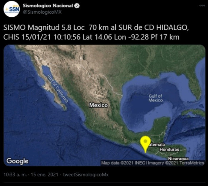 ''SISMO Magnitud 5.8 Loc  70 km al SUR de CD HIDALGO, CHIS 15/01/21 10:10:56 Lat 14.06 Lon -92.28 Pf 17 km'', indicó en sus redes sociales.