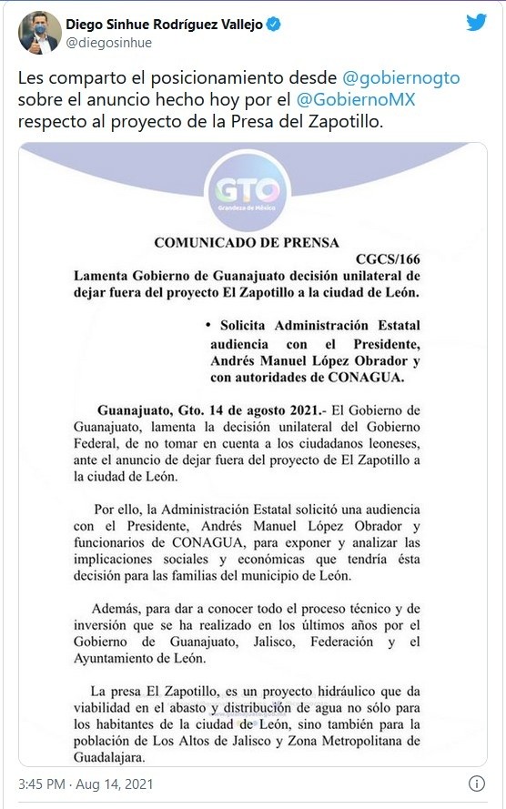 La determinación de que el agua de la presa El Zapotillo sea sólo para Jalisco fue una decisión unilateral, consideró Diego Sinhue Rodríguez Vallejo; gobernador de Guanajuato, esto luego de que el Presidente de la República, Andrés Manuel López Obrador (AMLO) planteara retomar las obras, sin inundar poblaciones, y que el agua se distribuya sólo en Jalisco; Rodríguez Vallejo lamentó que no se considere el trasvase a León como estaba planteado en el proyecto original.“Guanajuato lamenta la decisión unilateral del Gobierno Federal de no tomar en cuenta a los ciudadanos leoneses, ante el anuncio de dejar fuera del proyecto de El Zapotillo a la ciudad de León. Por ello, la Administración Estatal solicitó una audiencia con el Presidente y funcionarios de la Comisión Nacional del Agua para exponer y analizar las implicaciones sociales y económicas que tendría esta decisión para las familias del municipio de León”, se expone en un comunicado.También pidió que se dé a conocer todo el proceso técnico y de inversión que han realizado en los últimos años por el Gobierno de Guanajuato, Jalisco, Federación y el Ayuntamiento de León. Subrayó que la presa fue proyectada para dar viabilidad al abasto de agua de León, la región de Los Altos de Jalisco y la Zona Metropolitana de Guadalajara.Enfatizó la urgencia de que las instancias federales planteen alternativas para atender la demanda de agua potable para los habitantes de León.Si te interesó esta noticia y quieres saber más, entonces descarga y descubre INFORMAPlus, la aplicación digital de EL INFORMADOR, en donde tenemos contenidos exclusivos, seleccionados por nuestros editores, para darles una experiencia más completa a los lectores. Si eres suscriptor de EL INFORMADOR tu acceso está incluido, solicítalo al 33 3678-7777Descarga la aplicación y pruébala GRATIS por treinta días.Para iOS: https://apple.co/35jaVgbPara Android: https://bit.ly/3gwVSEVJM