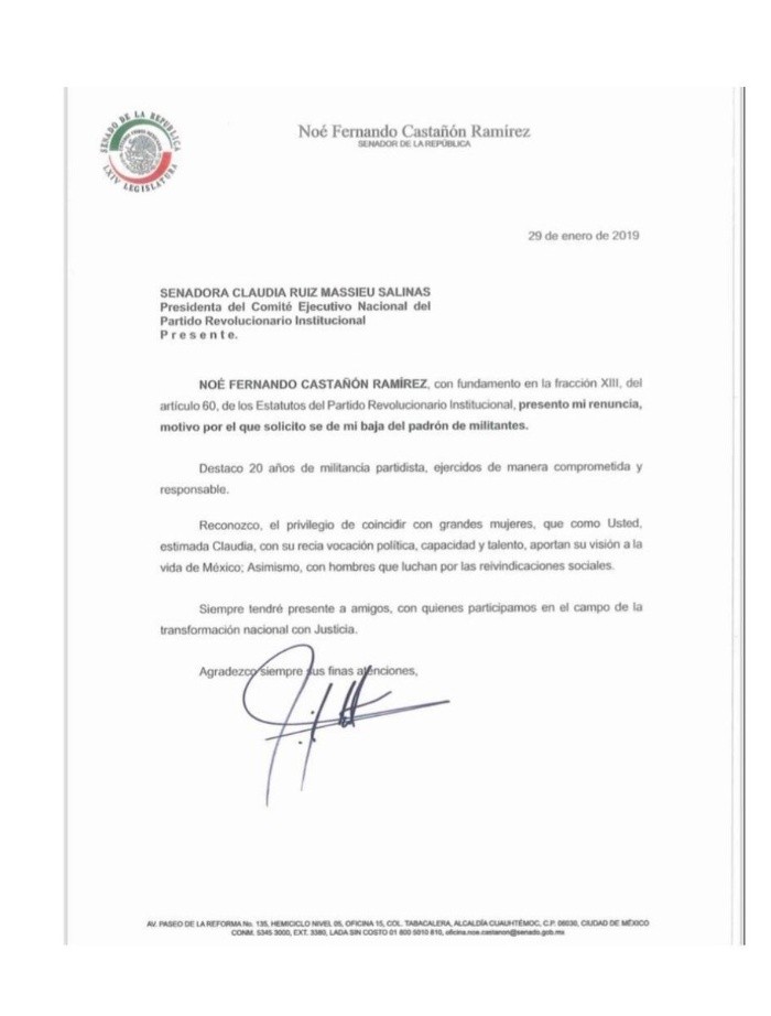 El senador del Partido Revolucionario Institucional (PRI), Noé Castañón, quien fue acusado de violencia doméstica, renunció a su militancia priísta a través de una carta que envió a la presidenta nacional, Claudia Ruiz Massieu.Noé Castañón rindió protesta como legislador el 30 de octubre del año pasado, en medio de una ola de reclamo y de la oposición de diversas senadoras como Xóchitl Gálvez del Partido Acción Nacional (PAN) y Malú Micher (Morena).Militó 20 años en el PRI, y fue acusado por su ex esposa, Mayte López, de violencia familiar, por lo que fue citado a declarar ante un Juzgado de Control y Tribunal de Enjuiciamiento en el Centro Estatal Preventivo "El Canelo" en Chiapa de Corzo, tras ser detenido en Monterrey, Nuevo León.Mayte López González lo acusó de haberse raptado a sus tres hijos en septiembre de 2016, además de impedirles tener contacto con ella.JM