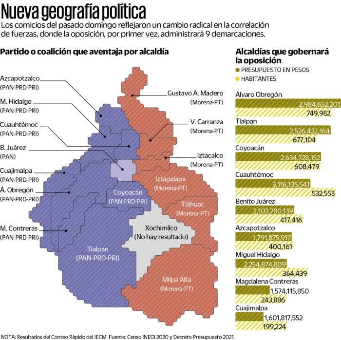 El partido Movimiento Regeneración Nacional (Morena), del Presidente Andrés Manuel López Obrador (AMLO), y sus aliados se desplomaron en las elecciones de ayer domingo 6 de junio en la Ciudad de México, bastión tradicional de la izquierda, al ganar solo en siete de las 16 alcaldías que forman la capital.Según el Programa de Resultados Electorales Preliminares, con un avance del 95% escrutado, la coalición opositora "Va por México" ganó los comicios al imponerse en nueve demarcaciones, un resultado histórico para los conservadores que hasta ahora solo dominaban dos.El mapa de la ciudad, una de las más grandes del mundo, quedó totalmente partido por la mitad, donde la derecha se llevó las alcaldías del oeste y la izquierda las del este."Va por México" ganó en Azcapotzalco, Miguel Hidalgo, Cuauhtémoc (incluye el centro histórico), Benito Juárez, Coyoacán, Cuajimalpa, Álvaro Obregón, Magdalena Contreras y Tlalpan.En cambio, Morena, que hasta ahora controlaba 14 alcaldías, solo pudo conservar siete: Gustavo A. Madero, Venustiano Carranza, Iztacalco, Iztapalapa (la más poblada), Tláhuac y Xochimilco.Una derrota que llega un mes después del accidente en la Línea 12 del Metro de la CDMX, que dejó 26 muertos.Muchos ciudadanos culparon por la tragedia a dos delfines de López Obrador: la alcaldesa Claudia Sheinbaum y al canciller mexicano, Marcelo Ebrard, quien construyó la línea cuando dirigió la capital.En cuanto a los votos por partido, Morena sí logró ser el mayoritario con el 40.1% de los votos, seguido del Partido Acción Nacional (PAN) con el 26%, el Partido Revolucionario Institucional (PRI) con el 14.4% y el Partido de la Revolución Democrática (PRD) con el 5.8%, todos ellos aliados contra Morena.Pero los resultados en las alcaldías supone un batacazo para el partido, que desde 2018 gobierna en la capital con Sheinbaum, cuyo mandato expira en 2024.La capital ha sido un feudo de la izquierda mexicana desde 1997, cuando el entonces Distrito Federal eligió por primera vez por voto popular a su alcalde, Cuauhtémoc Cárdenas, del PRD.El presidente López Obrador también gobernó la Ciudad de México entre 2000 y 2005 con el PRD, partido que abandonó para fundar Morena, formación que lo llevó a la presidencia de México en 2018, mismo año en el que la morenista Claudia Sheinbaum arrebató la capital a los perredistas.Este domingo, se celebraron las elecciones más grandes de la historia de México, al renovarse a la vez la Cámara de Diputados, 15 de 32 gobernadores estatales, 30 congresos locales y miles de ayuntamientos.La elección se interpretó como un plebiscito a López Obrador, cuyo partido consiguió con sus aliados retener la mayoría absoluta en la Cámara de Diputados y ganar en la mayoría de estados, aunque ya no tendrán la mayoría calificada de dos tercios de la Cámara Baja para reformar la Constitución.GC