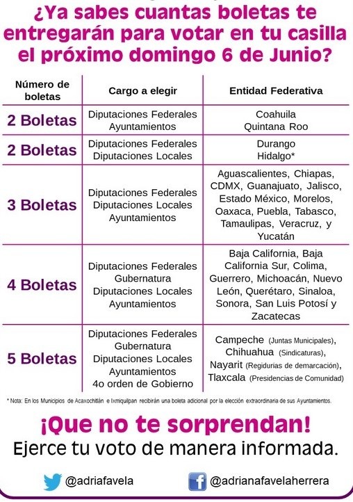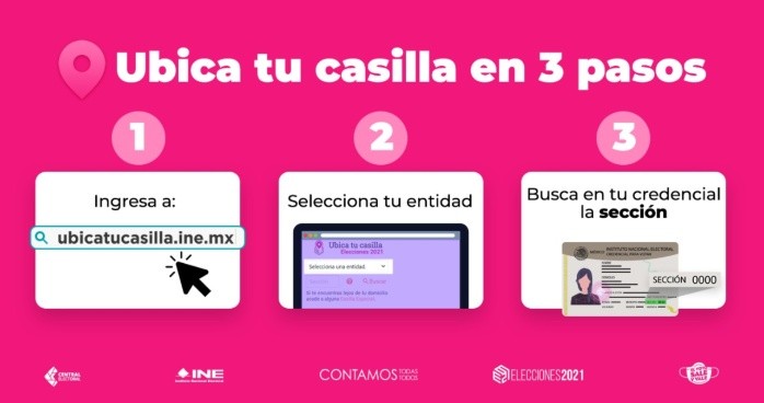 La jornada de elecciones 2021 en México está próxima y en esta guía te explicamos lo que debes saber al acudir a la casilla y votar el 6 de junio. ¿Dónde se ubica tu casilla?, ¿cómo marcar las boletas electorales?, ¿puedo llevar mi propia pluma para votar? Respondemos estas y otras preguntas para la jornada electoral conforme a información del Instituto Nacional Electoral (INE).Por teléfono, llama a INETEL: 800 433 2000Puedes consultarla en la siguiente página del INE: https://ubicatucasilla.ine.mx/En esta ocasión es solo por los cargos de diputados a nivel local y federal por el principio de mayoría relativa y representación proporcional. Podrás votar en:Para ubicar las casillas especiales, indica el estado en la página del INE: https://ubicatucasilla.ine.mx/*En el caso de la boleta de diputaciones federales, cuando marcas el recuadro de un partido político en la boleta, también estás votando por las diputaciones de representación proporcional o plurinominales de ese partido (los listados de las candidaturas están impresos al reverso de la boleta). Dependiendo del estado donde votes, te entregarán entre 2 y 5 boletas para los distitntos cargos de elección. Adriana Favela, consejera electoral del Consejo General del INE, compartió en sus redes sociales información al respecto. IM