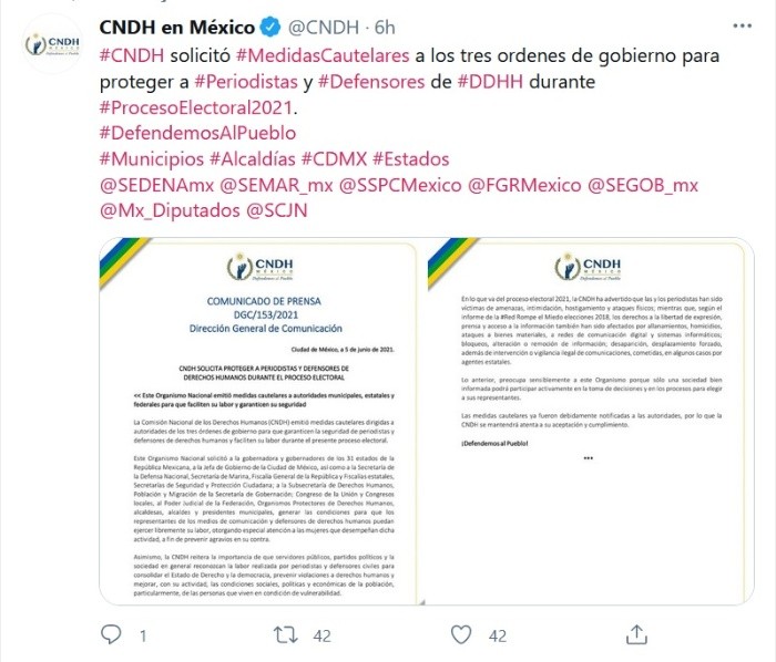 La Comisión Nacional de los Derechos Humanos (CNDH) solicitó a los tres órdenes de gobierno proteger a periodistas y defensores de derechos humanos durante la jornada electoral de este domingo, pues durante el proceso electoral 2021 han sido víctimas de amenazas, intimidación y ataques físicos.Ante ello, el organismo pidió a diversas autoridades generar las condiciones para que los comunicadores puedan ejercer libremente su labor, dando especial atención a las mujeres que desempeñan esta actividad, a fin de prevenir agravios en su contra.La CNDH aseguró que en lo que va del proceso electoral 2021, ha advertido que los periodistas han sido víctimas de amenazas, intimidación, hostigamiento y ataques físicos.Indicó que, según el informe de la #Red Rompe el Miedo elecciones 2018, los derechos a la libertad de expresión, prensa y acceso a la información también han sido afectados por allanamientos, homicidios, ataques a bienes materiales, a redes de comunicación digital y sistemas informáticos; bloqueos, alteración o remoción de información; desaparición, desplazamiento forzado, además de intervención o vigilancia ilegal de comunicaciones, cometidas, en algunos casos por agentes estatales.Lo anterior, indicó, preocupa sensiblemente al organismo porque sólo una sociedad bien informada podrá participar activamente en la toma de decisiones y en los procesos para elegir a sus representantes.JM