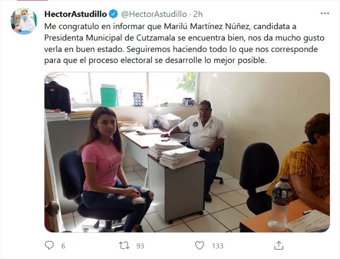 El gobernador Héctor Astudillo informó que Marilú Martínez, candidata de Movimiento Ciudadano a la alcaldía de Cutzamala de Pinzón, Guerrero, fue localizada y se encuentra bien."Me congratulo en informar que Marilú Martínez Núñez se encuentra bien, nos da mucho gusto verla en buen estado", escribió el gobernador de Guerrero a través de su cuenta de Twitter. El mensaje fue acompañado de una fotografía de la candidata.Señaló que su gobierno continuará haciendo todo lo que le corresponde para que el proceso electoral del próximo domingo 6 de junio se desarrolle "lo mejor posible".Este miércoles 2 de junio, el dirigente nacional de Movimiento Ciudadano, Clemente Castro, denunció el secuestro de su candidata y exigió al gobierno estatal intervenir para resolver el caso."Recibí noticias de que Marilú Martínez Núñez, nuestra candidata a la alcaldía de Cutzamala de Pinzón, Guerrero, y su familia fueron secuestrados por un grupo armado. Exigimos una reacción inmediata de las autoridades y del Gobernador Héctor Astudillo para localizarlos con vida", escribió en la red social.JM