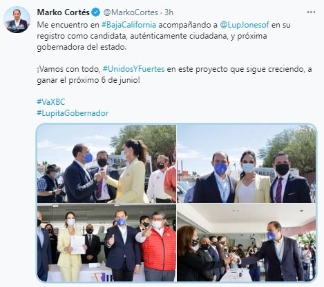 Este sábado, Lupita Jones se registró como candidata a la gubernatura de Baja California por la alianza "Va por BC", integrada por los partidos PAN, PRI y PRD. El presidente nacional del Partido Acción Nacional (PAN), Marko Cortés, señaló que confía en que la ex Miss Universo gane la elección del próximo 6 de junio y destacó que es una candidata "auténticamente ciudadana"."¡Vamos con todo, #UnidosYFuertes en este proyecto que sigue creciendo, a ganar el próximo 6 de junio!", expresó en redes sociales el líder panista.Al ser presentada como aspirante a inicios de mes, Jones dijo que hace 30 años fue Miss Universo, pero en ese tiempo ha construido una carrera como empresaria que actualmente le permite considerarse preparada para contender por la gubernatura.En ese entonces, explicó que cuando recibió la oferta de ser candidata decidió acercarse con la gente y para eso mantuvo un gira de trabajo en los municipios de Baja California, donde habló con parte de la población para conocer su sentir y si sería bien recibida."Ten cuidado con lo que deseas porque se puede hacer realidad (...) Si yo acepto es porque vamos a ganar. Vemos a Baja California como un proyecto superior más allá de los intereses de algunos grupos (...) estoy en tercer lugar y todavía no había dicho que sí", dijo.Aseguró que las dirigencias del PAN, PRI y PRD prometieron respetar su criterio e ideología al identificarse como ciudadana y no parte de alguno de los tres partidos que representará en el periodo electoral.NR