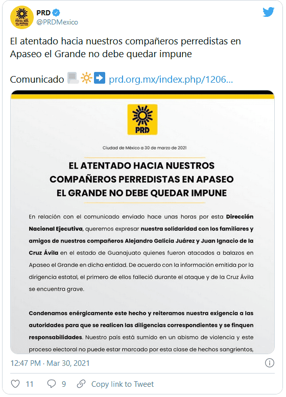 El candidato perredista a regidor en el ayuntamiento de Apaseo El Grande, Guanajuato, Alejandro Galicia Juárez; así como el delegado del Comité Estatal del PRD en este municipio, Juan Ignacio de la Cruz Ávila, fueron asesinados a balazos cuando realizaban un recorrido en busca de bardas para la campaña electoral.El ataque ocurrió este lunes por la mañana en la avenida del Vicario, en la colonia El Cerrito, a manos de sujetos armados que dispararon contra los políticos y se dieron a la fuga en un vehículo.La Fiscalía General del Estado se ha reservado la información del atentado.Galicia Juárez tenía la calidad de candidato a regidor propietario en la planilla que encabeza el candidato a la Presidencia Municipal Juan Mandujano Ramírez.La dirigencia nacional del PRD condenó la cobarde agresión con armas de fuego en el que le arrebataron la vida de su candidato y a su dirigente local, y exigió a las autoridades de los tres niveles de gobierno investigar a fondo este ataque y que finquen responsabilidades.Asimismo, hizo un llamado enérgico para que estos asesinatos no queden archivados ni impunes. "Queremos que las autoridades investiguen a fondo y se castigue a quien o quienes resulten responsables", enfatizó.En un comunicado, el PRD señaló que "este lamentable suceso forma parte, por desgracia, de una ola de agresiones y homicidios contra las y los militantes de nuestro instituto político, "situación que exigimos cese de inmediato".El PRD destacó que las autoridades tienen la obligación de dar garantías de seguridad. "Este proceso no puede ni debe seguir pintado de sangre", acotó."Teniendo como contexto que este es el proceso electoral más grande de la historia de México, las autoridades tienen la obligación de garantizar elecciones de paz, en un ambiente de civilidad y sobre todo garantizarle a la ciudadanía, así como a las y los candidatos su seguridad", puntualizó.JM