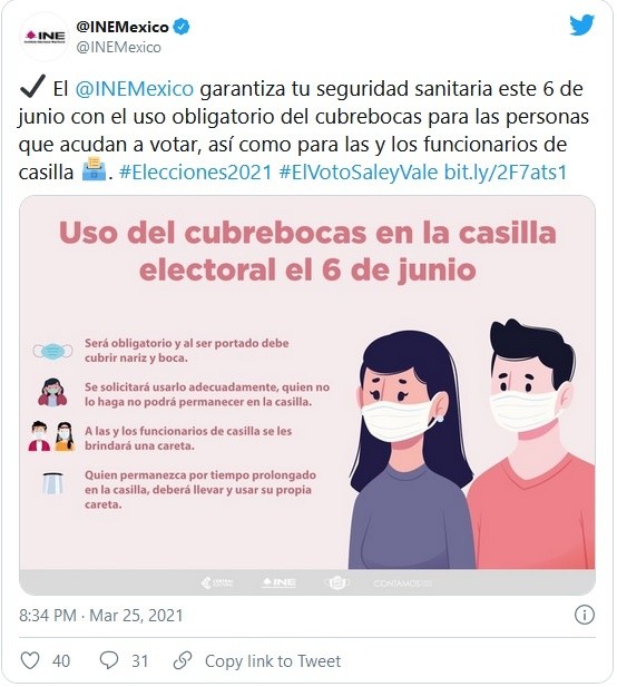 El próximo 6 de junio, todo votante que acuda a casillas electorales a emitir su sufragio deberá usar obligatoriamente, un cubrebocas.El Consejo General del INE aprobó esta tarde un proyecto mediante el cual se obliga a utilizar cubrebocas a toda aquella persona que ingrese a una casilla de votación el 6 de junio próximo, y deberá portarlo todo el tiempo que esté al interior de ésta. A quien no porte un cubrebocas, se le proporcionará uno.Si el ciudadano o ciudadana se niega a usar el cubrebocas, se le negará la entrada a la casilla. En el supuesto de que el votante se encuentre dentro de la casilla y se quite el cubrebocas, el presidente de casilla podrá pedirle que se retire.El acuerdo fue aprobado por unanimidad.La consejera Norma de la Cruz manifestó inquietud sobre la posibilidad de que impedir el ingreso a la casilla sin un mascarilla pueda coartar la libertad política que tiene cada persona.JM
