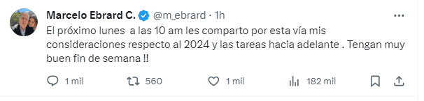 Marcelo Ebrard anunció que el próximo lunes a las 10:00 horas dará a conocer su posicionamiento respecto al proceso electoral 2024.En sus redes sociales, el excanciller deseo a sus seguidores un "muy buen fin de semana!!" y anunció que compartirá en ese medio "sus consideraciones".El excanciller impugnó en septiembre el proceso interno de Morena en el que resultó ganadora Claudia Sheinbaum.Este domingo es las fecha límite para que Marcelo Ebrard pueda inscribirse al proceso de Movimiento Ciudadano para buscar la candidatura presidencial.MM
