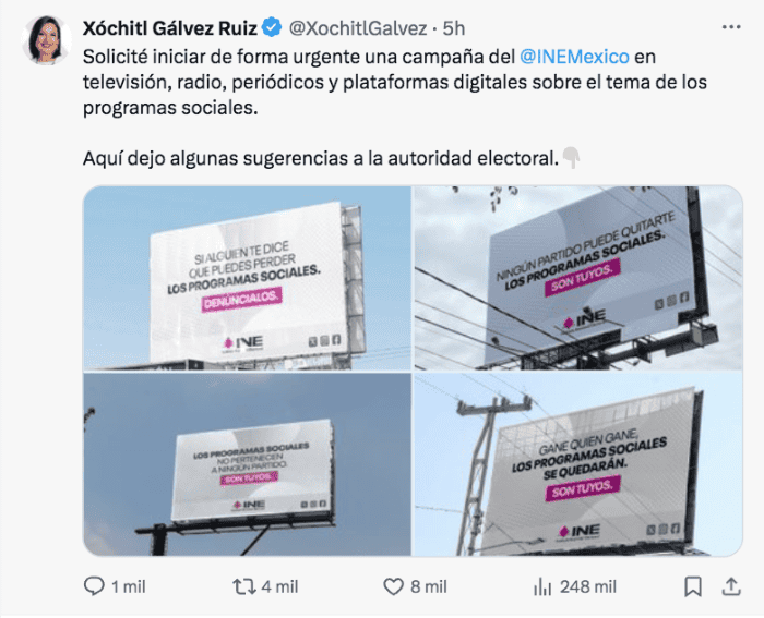 Luego de que la candidata a la presidencia del PRI, PAN y PRD, Xóchitl Gálvez, utilizara la imagen y colores institucionales del Instituto Nacional Electoral (INE) en espectaculares publicitarios sin autorización, el INE anunció que emprendera acciones legales.La vocera del INE, Carla Astrid Humphrey Jordan, calificó este hecho como “muy grave” y dijo que se iniciará un procedimiento para ordenar el retiro inmediato de la mencionada propaganda y para emprender acciones legales por el mal uso del emblema institucional. Agregó que el INE no participa en campañas electorales y que el actuar de la candidata del PRI, PAN y PRD “daña a los mexicanos”. EE