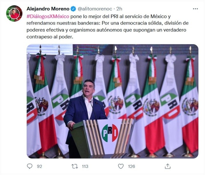 "El país está por conocer al mejor PRI de la historia, estamos listos para regresar a gobernar al país", aseguró el presidente nacional de ese partido, Alejandro Moreno Cárdenas, al iniciar el foro denominado "Diálogos por México", en el que participan algunos de los aspirantes a la candidatura presidencial del tricolor en 2024.En el Auditorio Plutarco Elías Calles, de la sede nacional del PRI, Moreno Cárdenas hizo un nuevo llamado al fortalecimiento de la coalición Va por México, pero que incluya a Movimiento Ciudadano, pues "todos cabemos" en este proyecto encabezado por el tricolor."Nuestra convocatoria es y será amplia y hay lugar para todos en este proyecto aliancista: PAN, PRD y Movimiento Ciudadano son y serán bienvenidos y tenemos que reforzar nuestra alianza partidista. Pero quiero poner el acento en una alianza todavía más importante y todos los sabemos, la alianza es con los ciudadanos, un pacto fundado en la confianza y en el aval que dan los resultados que siempre el PRI entrega a la nación", enfatizó."México aún está por conocer al mejor PRI de todos los tiempos. El PRI está listo para regresar y volver a gobernar en coalición", puntualizó."Tenemos proyecto, partido, rumbo y futuro, porque la unidad y la política imperan y porque el PRI es un partido potente, grandioso, imparable y el verdadero partido de México", subrayó.Acompañado de los expresidentes nacionales del PRI, Manlio Fabio Beltrones Rivera, José Antonio González Fernández, Pedro Joaquín Coldwell y Beatriz Paredes Rangel, así como de la secretaria general Carolina Viggiano, Alejandro Moreno advirtió: "con toda seguridad les digo que no validaremos los intentos del poder por dividirnos, dividir a la oposición y dividir al pueblo de México".Sostuvo que en la pluralidad de todas las expresiones del priismo está la fortaleza del tricolor, sin importar los vaivenes de la coyuntura política."Nos une, nos define y nos identifica que todas y todos los aquí presentes somos priistas, que pertenecemos a una institución con 93 años de historia, que construyó México y que lo volverá a hacer", aseguró.JM