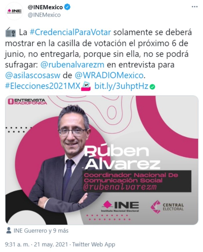 El Instituto Nacional Electoral (INE) aclaró que la credencial de elector se deberá mostrar, en las casillas de votación, el próximo 6 de junio porque sin ella, no se vota.Los protocolos por COVID-19 para las elecciones los elaboró el INE y son del conocimiento de las autoridades de salud, destacó el organismo a través de un mensaje difundido en Twitter.El consejero presidente del Instituto, Lorenzo Córdova, también escribió en Twitter que es necesario llevar la credencial de elector, para poder votar."El 6 de junio, lleva tu credencial para votar del @INEMexico a la casilla. #Elecciones2021Mx", indicó. De acuerdo con las medidas sanitarias, para poder votar se debe llevar la credencial, pero esta no será entregada como en otras ocasiones, al funcionario o funcionaria de casilla se le deberá mostrar para que revise el nombre y así busque en la lista correspondiente. La intención es que el votante no entregue su credencial, por un tema sanitario. Incluso, al hacerse la marca que indica que se votó, la persona la pondrá frente al funcionario y este, con la máquina correspondiente, simplemente hará la marca.En un primer informe sobre las medidas sanitarias que se llevarán a cabo en la jornada electoral del 6 de junio, la Secretaría de Gobernación indicó que entre las acciones está el evitar "solicitar la credencial de elector" a la persona, con el fin de mitigar contagios de COVID-19 durante el proceso.Sin embargo, más tarde la Secretaría de Salud aclaró que sí se solicitará a quien ejerza su derecho al voto, pero con la indicación de que sólo se deberá mostrar al funcionario de casilla, sin hacer entrega de la misma.OF
