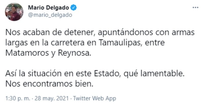 El líder nacional de Morena, Mario Delgado, denunció a través de sus redes sociales que fue detenido con armas largas en una carretera de Tamaulipas, en un punto entre los municipios de Matamoros y Reynosa.''Nos acaban de detener, apuntándonos con armas largas en la carretera en Tamaulipas, entre Matamoros y Reynosa'', publicó Mario Delgado en su cuenta de Twitter."Así la situación en este Estado, qué lamentable. Nos encontramos bien", escribió en redes sociales. Asimismo, Delgado compartió un video en el que se observa la detención que denunció.OF