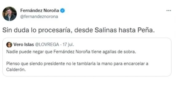 En caso de ganar la Presidencia de México en 2024, el diputado Gerardo Fernández Noroña procesaría a los expresidentes de México, desde Carlos Salinas de Gortari hasta Enrique Peña Nieto.A través de sus redes sociales, el aspirante presidencial dijo que "sin duda" actuaría contra Carlos Salinas de Gortari, Ernesto Zedillo, Vicente Fox, Felipe Calderón y Enrique Peña Nieto."Nadie puede negar que Fernández Noroña tiene agallas de sobra. Pienso que siendo presidente no le temblaría la mano para encarcelar a Calderón", le escribió una seguidora en redes sociales."Sin duda lo procesaría, desde Salinas hasta Peña", respondió el diputado del Partido del Trabajo.También en sus redes sociales, Fernández Noroña contó un "secreto": "Soy feliz, soy un hombre feliz, y quiero que me perdonen todos los derechosos por mi felicidad…"JM