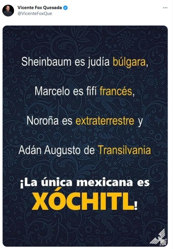 El expresidente Vicente Fox Quesada fue nuevamente criticado en redes sociales tras mostrar su apoyo a Xóchitl Gálvez, aspirante a la candidatura presidencial por el Frente Amplio por México.Fox mostró su apoyo a Xóchitl Gálvez mediante un tuit en el que denostaba a los aspirantes presidenciales de Morena.En el tuit, el expresidente dice que "Sheinbaum es judía búlgara, Marcelo es fifí frances, Noroña es extraterrestre y Adán Augusto de Transilvania".Finalizaba su mensaje con la frase "¡La única mexicana es Xóchitl!".Al respecto usuarios de Tuitter criticaron a Vicente Fox con mensajes en los que lo tacharon de xenófobo y antisemita."Vicente, por lo general me divierten tus ocurrencias, aunque vea que perjudican a la oposición. Pero este acto de xenofobia, antisemitismo y discriminación es INACEPTABLE. Maxime, de un expresidente".También pidieron que bajara ese mensaje porque no ayudaba a Xóchitl Gálvez.¡Otra vez Chente! No ayudas para nada a Xóchitl. Si quieres apoyarla borra ahora mismo este tuit, es grotesco, muy desafortunado. De paso considera borrar tu cuenta de Twitter o por lo menos no volver a mencionarla, por favor.vll