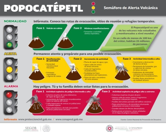 La Coordinación Nacional de Protección Civil elevó el nivel de alerta del volcán Popocatépetl del semáforo amarillo en fase 2 a fase 3.Las modificaciones se dan tras el cambio en el comportamiento tradicional del volcán y de manera preventiva, informó el Centro Nacional de Prevención de Desastres (Cenapred) de la Secretaría de Gobernación.El Cenapred descartó por el momento la evacuación de población en zonas cercanas al Popocatépetl. La alerta amarillo fase 3 se caracteriza por:El volcán ha tenido mayor actividad en las últimas semanas. La víspera, el "Popo" registró una explosión que dejó una columna de ceniza de 2.5 kilómetros.La Coordinación General de Protección Civil del Estado de Puebla informó vía Twitter que, de acuerdo con el modelo de dispersión de partículas, las emisiones del Popocatépetl podrían dirigirse en las próximas 12 horas a los municipios Tochimilco, Atzitzihuacan y Huaquechula.Asimismo, abundó, hacia Tepemaxalco, Acteopan, Cohuecan, Tepexco, Tepeojuma e Izúcar, así como hacia algunos municipios de Morelos. Con información de SUNIM