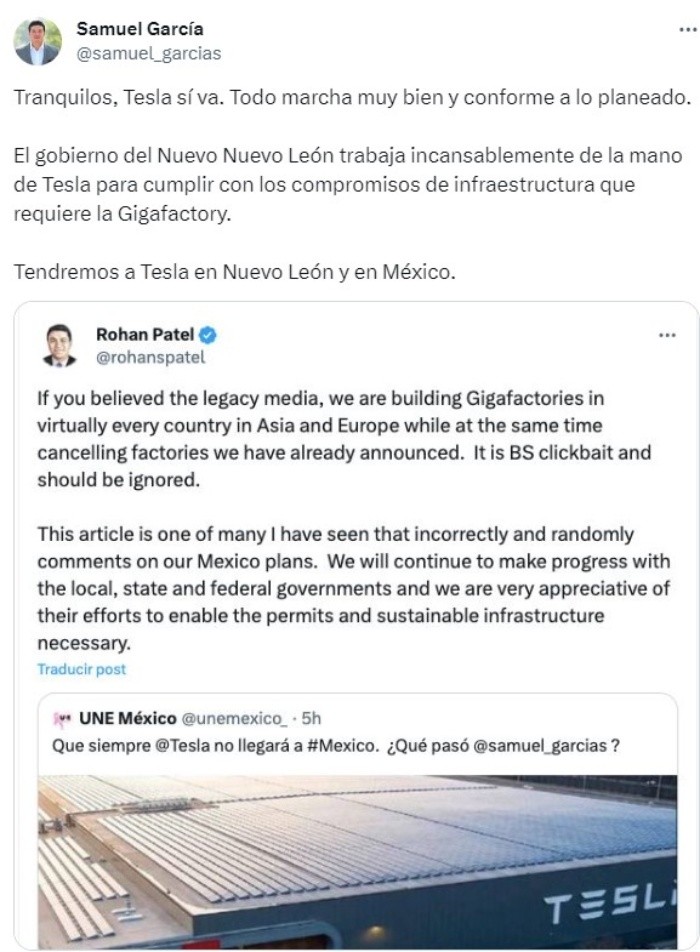 Tesla, la empresa que dirige Elon Musk y que se dedica al diseño, fabricación y venta de automóviles, podría no tener su planta mexicana en Nuevo León.Esta información se basa en detalles que fueron revelados por el escritor Walter Isaacson, quien se dedica a seguir la vida del multimillonario y redactar su biografía.Isaacson asegura que Musk habría tomado la decisión de cancelar la inversión para construir una planta de ensamblaje para autos eléctricos Tesla, la cual se ubicaría en Santa Catarina, Nuevo León, México y en su lugar la instalaría en Austin, Texas.De acuerdo a algunos fragmentos del libro biográfico de Elon Musk, escrito por Walter, el empresario ya tenía planeado que su nueva fábrica estuviera en México, sin embargo, al estar bastante lejos de la fábrica de diseño surgió un dilema en su mente, no lograría que sus mejores ingenieros se trasladaran a tierras mexicanas."Siempre había creído que los ingenieros de diseño de Tesla debían estar ubicados justo al lado de la línea de ensamblaje, en lugar de permitir que la fabricación se hiciera en una ubicación remota. De esa manera, los ingenieros podrían obtener información instantánea sobre cómo diseñar innovaciones que mejorarían el automóvil y facilitarían su fabricación.“Esto es particularmente cierto para un automóvil y un proceso de fabricación completamente nuevos. Pero se dio cuenta de que tendría problemas para lograr que sus mejores ingenieros se trasladaran a la nueva fábrica. ‘Los ingenieros de Tesla tendrán que estar en el lugar para tener éxito, y lograr que todos se muden a México nunca sucederá’, me dijo”.Estos fragmentos fueron tomados de las páginas 568 y 569 del libro "Elon Musk" y a raíz de las cuales ha surgido la duda respecto al arrepentimiento del empresario sobre su inversión en México.Durante la la Reunión Anual de Industriales en León, Guanajuato, Samuel García, Gobernador de Nuevo León, habló del tema e informó que la empresa se comunicó con él y a través de un comunicado le solicitaron que comenzara con los proyectos no fiscales que se negociaron para iniciar la construcción de la planta, en alusión a proyectos de infraestructura como una salida ferroviaria, accesos terrestres y planta tratadora de agua.Por su parte el vicepresidente de Políticas Públicas y Desarrollo Empresarial de Tesla, Rohan Patel, vía X aseguró que los planes siguen.“Si creyera en los medios tradicionales, estamos construyendo gigafábricas en prácticamente todos los países de Asia y Europa y, al mismo tiempo, cancelamos fábricas que ya hemos anunciado. Es clickbait y debe ignorarse”“Este artículo es uno de muchos que he visto que comenta de manera incorrecta y aleatoria sobre nuestros planes en México. Continuaremos avanzando con los gobiernos locales, estatales y federales y apreciamos mucho sus esfuerzos para habilitar los permisos y la infraestructura sostenible necesarios”.Samuel García compartió esto mismo en su perfil y reiteró que todo va bien con los planes.YC