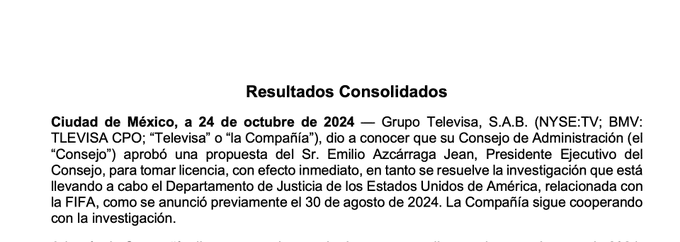Emilio Azcárraga Jean, durante muchos años presidente del Grupo Televisa, dejará el cargo de consejero delegado de la empresa, pero seguirá siendo presidente, según informó el jueves la compañía, esto en medio de una investigación de Estados Unidos vinculada a la FIFA.Azcárraga dirigió la mayor productora de contenidos en español del mundo durante 20 años, tras tomar el relevo de su padre, que fundó la empresa en 1973.Dos de sus principales asesores, Alfonso de Angoitia, vicepresidente y jefe de finanzas de la empresa, y Bernardo Gómez, que supervisa la división de noticias y relaciones gubernamentales de Televisa, asumirán el cargo de consejeros delegados conjuntos en enero, informó la empresa. Televisa es uno de los principales proveedores de contenidos de Univision y forma parte del grupo de inversores propietario de Univision Communications Inc. La acción de Televisa, considerada la compañía de medios de comunicación más grande en el mundo de habla hispana, subió este jueves 3.1% y terminó en 9.25 pesos en la BMV, tras bajar ayer 4%, señalan datos de la agencia Bloomberg. La salida de Azcárraga deja un vacío en la dirección de Grupo Televisa, una de las principales empresas de medios en América Latina, que ha estado en el centro de importantes desarrollos en el mundo del entretenimiento y el deporte. Con la renuncia de uno de los líderes más influyentes de la industria, el futuro de Grupo Televisa se encuentra en una encrucijada, mientras la empresa navega por un panorama mediático cada vez más competitivo y complejo. En un comunicado de la Bolsa Mexicana de Valores se informa que Emilio Azcárraga Jean ha dejado la presidencia de Grupo Televisa de manera inmediata, en el contexto de la investigación del Departamento de Justicia relacionada con la corrupción en la adquisición de los derechos de transmisión de los mundiales de futbol. "El Consejo aprobó una propuesta del Sr. Emilio Azcárraga Jean, Presidente Ejecutivo del Consejo, para tomar licencia, con efecto inmediato, en tanto se resuelve la investigación que está llevando a cabo el Departamento de Justicia de los Estados Unidos de América, relacionada con la FIFA", señaló la empresa en su reporte financiero del tercer trimestreDepartamento de Justicia de los Estados Unidos acusó a la televisora de “inflar artificialmente” el valor de los certificados de depósito ADR (American Depositary Receipt) en donde se ocultaban sobornos por 15 millones de dólares para la obtención de los derechos de la Copa del Mundo de 2018 y 2022, además de las próximas justa mundialistas en 2026 y 2039.EE