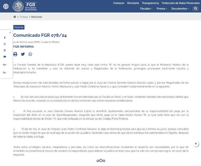 De último momento, un juez anuló la medida de prisión preventiva justificada a Emilio Lozoya, exdirector de Pemex, por lo que regresará a prisión domiciliaria portando un brazalete electrónico, retiro de pasaporte, la prohibición de salir del país y la firma del libro de procesados cada 15 días, al considerar que no existe riesgo de que se sustraiga de la acción de la justicia.Con esto, Lozoya seguirá su proceso por el caso Agronitrogenados en libertad. Saldrá del Reclusorio Norte, de la Ciudad de México, dónde estuvo preso más de dos años. Por su parte, la Fiscalía General de la República (FGR) publicó un comunicado con el que "quiere dejar muy claro que Emilio 'N' no ha ganado ningún juicio".Según la FGR, las resoluciones sobre Lozoya fueron dictadas en forma parcial e ilegal por el Juez de Control Gerardo Genaro Alarcón López y por los Magistrados de los Tribunales de Apelación Alberto Torres Villanueva y Juan Pedro Contreras Navarro.Señala en un comunicado que el Juez de Amparo Juan Pedro Contreras Navarro, lo deja en libertad procesal para que así continúe su juicio, porque considera que no existe riesgo de que se sustraiga de la acción de la justicia, haciendo caso omiso de que dicho individuo fue aprehendido en España, después de haberse dado a la fuga.Ante esto, la FGR dijo que de inmediato se presentará el recurso de revisión correspondiente, para obtener la justicia en este caso.*Mantente al día con las noticias, únete a nuestro canal de WhatsAppOF