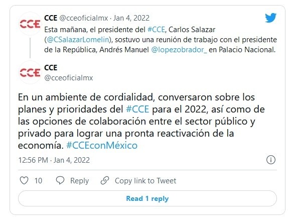 Luego de meses sin que existiera un encuentro entre el presidente del Consejo Coordinador Empresarial (CCE), Carlos Salazar Lomelín, y el Presidente Andrés Manuel López Obrador (AMLO), este martes se llevó a cabo una reunión de trabajo entre el mandatario y el líder empresarial.En un tuit del CCE, se aseguró que el encuentro se hizo "en un ambiente de cordialidad, conversaron sobre los planes y prioridades del #CCE para el 2022, así como de las opciones de colaboración entre el sector público y privado para lograr una pronta reactivación de la economía".En diciembre del 2021, los cerca de 50 empresarios que representan a las firmas más grandes del país y que integran el Consejo Mexicano de Negocios, se reunieron en AMLO en una comida a la que fue invitado Salazar Lomelín.Sin embargo, desde hacía meses no se tenía una reunión exclusiva entre el presidente del CCE y AMLO, como la que se registró la mañana de este martes en Palacio Nacional.Este encuentro se dio al día siguiente de que el Presidente López Obrador declarara que "no se pueden quejar de que les ha afectado a los empresarios" porque pueden invertir e incluso añadió que "les ha ido bien a pesar de la pandemia".JM