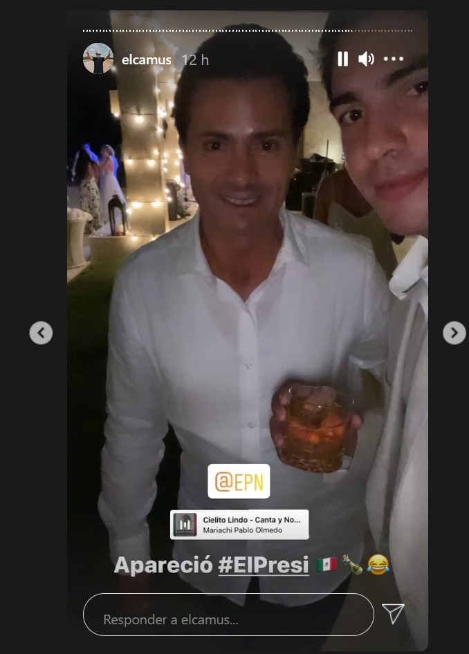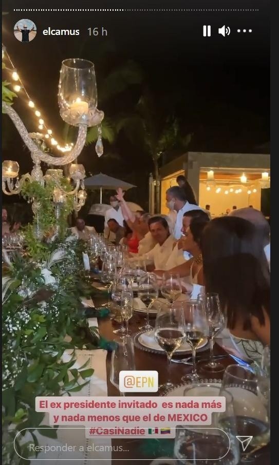 Enrique Peña Nieto, expresidente de México, fue captado este fin de semana en República Dominicana, en la boda de una exreina de belleza colombiana, de acuerdo con imágenes compartidas por el influencer Camus García Caballero. Medios de Colombia informaron que este sábado se realizó la boda entre Marcela García Caballero, exreina del Carnaval de Barranquilla y el empresario Sergio Chams.Al evento estuvo el influencer Camus García Caballero, hermano de la novia, compartió en su perfil de Instagram algunas historias con fotografías del evento. Ahí mostró en video al expresidente mexicano junto a su novia, la modelo Tania Ruiz.También compartió una selfie, con fondo la canción de Cielito Lindo, con Peña Nieto. Recientemente Peña Nieto reapareció en sus redes sociales para lamentar el fallecimiento de Sylvia Sánchez Estrada, esposa del exsenador Manlio Fabio Beltrones y madre de la senadora priista Sylvana Beltrones. En su cuenta oficial de Instagram, la última publicación que hizo Peña Nieto fue una imagen con la que daba a conocer su divorcio de Angélica Rivera el 2 de mayo de 2019, algunos meses después de terminar su mandato. IM