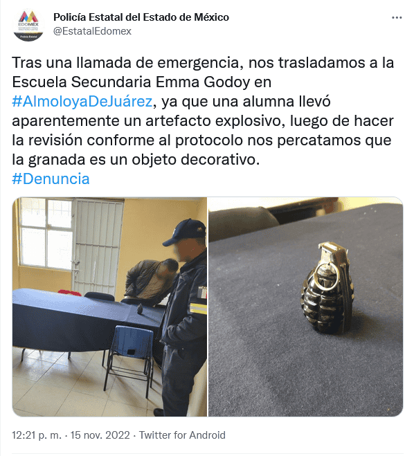 Una alumna de 12 años de edad llevó a la escuela un artefacto similar a una granada de plástico, provocando una intensa movilización policiaca en el municipio de Almoloya de Juárez, Estado de México, a la institución acudió personal de la Secretaría de Seguridad mexiquense, que informó que era un objeto de juguete.Con base en el reporte de policías estatales cerca de las 09:00 de la mañana recibieron una llamada de auxilio por parte de autoridades educativas de la Escuela Secundaria Emma Godoy, ubicada en las calles Hacienda San Ángel y Bicentenario, al interior del fraccionamiento Rancho San Juan.El director de la institución informó que una alumna de primer grado había llevado un artefacto similar a una granada para asustar a sus compañeros; por lo que personal de la Secretaría de Seguridad del Estado de México (SSEM) desplegó un operativo.Debido a la alerta, tanto alumnos como personal educativo fueron evacuados con el fin de proteger su integridad y al lugar llegaron elementos de la corporación de seguridad estatal, los cuales ingresaron al aula para analizar el objeto.Después de unos minutos llamaron a la calma, pues, descartaron que fuera un artefacto explosivo; explicaron que era un objeto de juguete decorado como una granada.Las actividades se reanudaron en la escuela y se solicitó la presencia de los padres de la menor para determinar algún tipo de sanción interna.OF