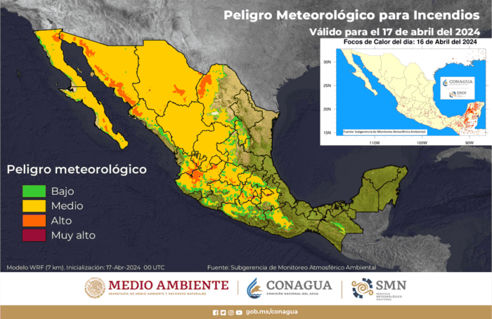 En México, hay temporadas de mayor impacto en los incendios forestales por condiciones meteorológicas, es una realidad que estos siniestros se pueden presentar en cualquier momento del año, sin embargo, la sequía puede tener un fuerte impacto para que se produzcan.El Servicio Meteorológico Nacional (SMN) ha indicado que en lo que va del año han sucedido 2.298 incendios en 28 entidades del país. Mientras que tan solo en la semana del 5 al 11 de abril se presentaron 102 incendios en un total de 2,654.97 hectáreas.Las entidades del país con mayor superficie quemada fueron Jalisco, Durango, Zacatecas, Puebla y Veracruz. representando el 91% de la superficie quemada durante la semana mencionada.Bajo estas circunstancias, el SMN ha dado aviso sobre algunas zonas en diversas entidades del país en donde el riesgo de la generación de incendios forestales por condiciones meteorológicas es muy alto, así como otros niveles de riesgo para considerar precauciones.Es necesario destacar que, según la Secretaría de Medio Ambiente y Recursos Naturales (Semarnat), las causas de incendios surgen, en un 99 por ciento, por las actividades humanas. Es por esto que es importante tomar medidas como evitar arrojar basura, materiales inflamables, vidrios o botellas, así como no encender fogatas.SV