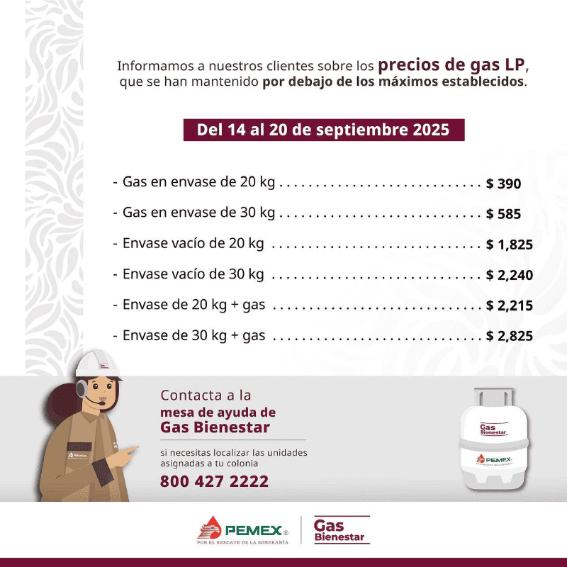 Gas Bienestar, creado en 2021 por la administración federal, nació con la finalidad de frenar la especulación en el mercado del gas LP, garantizar una distribución segura y aliviar el gasto en los hogares. Actualmente, su cobertura se concentra principalmente en la Ciudad de México. Este programa, respaldado por el Gobierno de México, tiene como meta ofrecer a las familias una opción más justa y accesible en el suministro de gas LP.Como parte de su operación regular, dio a conocer las tarifas que estarán vigentes del 15 al 20 de septiembre 2025; los precios se mantienen en un rango competitivo frente a las compañías privadas, con la intención de asegurar que los hogares capitalinos y de la zona metropolitana dispongan de una alternativa confiable y asequible.Estos precios reflejan el compromiso de proporcionar un energético esencial a costos accesibles dentro de los límites establecidos por la Comisión Nacional de Energía.-Gas en envase de 20 kg: $390-Gas en envase de 30 kg: $585-Envase vacío de 20 kg: $1,825-Envase vacío de 30 kg: $2,240-Envase de 20 kg con gas: $2,215-Envase de 30 kg con gas: $2,825Estos precios se mantienen dentro de los topes máximos establecidos por las autoridades regulatorias, como parte de la estrategia de Gas Bienestar para ofrecer un servicio de calidad con cilindros supervisados y sellos de garantía que aseguren el 100% del contenido.Solicitar el suministro de Gas Bienestar es un proceso sencillo y accesible. A través de su cuenta de X, este programa informó que la única manera de solicitar la venta de cilindros es por pedido.La empresa, que opera con camiones equipados con tecnología avanzada para garantizar seguridad y localización, invita a los consumidores a contactar al centro de ayuda al número 800 427 2222 para cualquier consulta o servicio. YC