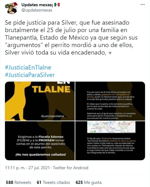 "¡Pobrecito perro no lo maten!", suplica una mujer a los integrantes de una familia que golpean con un palo, tabla y rocas a un animal hasta que lo matan.En un video difundido en redes sociales por la protectora de animales Mundo Patitas Oficial, se observa a varias personas que atacan a un can, que se encuentra en la azotea de un domicilio ubicado en el municipio mexiquense de Tlalnepantla, según dio a conocer la organización.Ante estos hechos, cibernautas crearon el hashtag #JusticiaEnTlalne para manifestar su enojo por los actos cometidos contra el can y para exigir a las autoridades correspondientes actúen con celeridad en el caso.También llamaron a una marcha para pedir al Congreso del Estado de México que se voten las reformas para que el maltrato animal sea clasificado como grave.Según indica la convocatoria, la marcha está anunciada para el martes 3 de agosto.Del mismo modo, actrices y actores se han pronunciado contra el maltrato animal.Eugenio Derbez exigió al gobernador mexiquense, Alfredo del Mazo, que las Autoridades castiguen a los responsables."Señor gobernador, este es una llamado no solo para que este delito no quede impune, sino para que se trabaje en la ley y que las penas sean mayores, que los delincuentes sean encarcelados porque este tipo de personas representan un peligro para la sociedad", dijo el reconocido actor.Vecina amaga con demandarEn las imágenes que captó una de las vecinas se aprecia que un hombre sostiene al perro mientras dos mujeres le pegan con un palo y una tabla."¡Los voy a demandar!", se escucha una voz femenil, aparentemente, de otra vecina, quien les advierte que denunciará lo que hacen.Sigue leyendo… Si te interesó esta noticia y quieres saber más, entonces descarga y descubre INFORMAPlus, la aplicación digital de EL INFORMADOR, en donde tenemos contenidos exclusivos, seleccionados por nuestros editores, para darles una experiencia más completa a los lectores.Descarga la aplicación y pruébala GRATIS por treinta días.OF