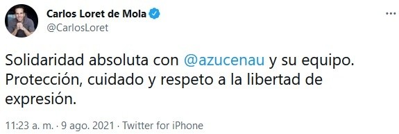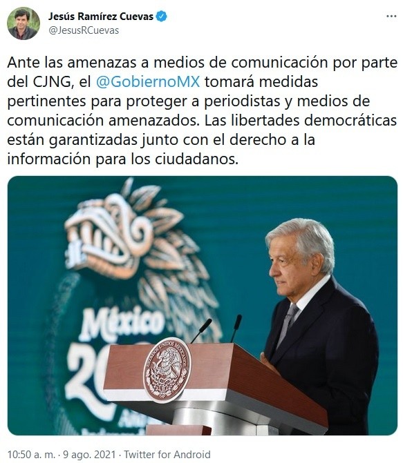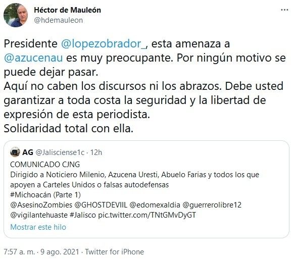 El Cártel Nueva Generación (CNG) amenazó a medios de comunicación, y directamente a la periodista Azucena Uresti, por la cobertura que realizan en Michoacán, donde esa organización genera violencia en su disputa con otro grupo armado.A través de un video, el CNG, encabezado por Nemesio Rubén Oseguera Cervantes "El Mencho" señaló sus "respetos para los noticiarios que hacen valer la libertad de expresión", pero exigió que "no protejan en sus noticias" y que "sean parejos porque yo no estoy en contra de la libertad de expresión".El video está "firmado" por Rubén Oseguera Cervantes y acusa a Juan Farías Álvarez "El Abuelo Farías" y a Hipólito Mora de no ser autodefensas, sino extorsionadores y delincuentes.Asimismo, en el video se amenaza a la periodista Azucena Uresti: "Azucena Uresti donde sea que estés, doy contigo y te haré que te comas tus palabras aunque me acusen de feminicidio, porque no me conocen a mí, Rubén Oseguera Cervantes, yo no soy cobracuotas ni extorsiono".Héctor de Mauleón expresó su solidaridad con Uresti y pidió al Presidente Andrés Manuel López Obrador (AMLO) que no deje pasar la amenaza."Aquí no caben los discursos ni los abrazos. Debe usted garantizar a toda costa la seguridad y la libertad de expresión de esta periodista", escribió De Mauleón en redes sociales."Mi solidaridad con Azucena Uresti, quien ha recibido amenazas de muerte directas y públicas, difundidas en redes sociales. Ya han sido hechas del conocimiento del Presidente López Obrador. Por lo delicado del tema él mismo debe hacerse responsable de su seguridad y de lo que pase", refirió el expresidente Felipe Calderón."Esto es inaceptable: ¿qué hará el gobierno?", agregó el expresidente."Solidaridad absoluta con Azucena Uresti y su equipo. Protección, cuidado y respeto a la libertad de expresión", escribió Carlos Loret de Mola."Solicito al presidente López Obrador que ordene protección inmediata para la periodista Azucena Uresti ante amenaza de muerte de parte del crimen organizado", exigió la senadora Lilly Téllez.Por su lado, el perredista Fernando Belaunzarán se unió a la demanda y solicitó a López Obrador que proteja a la periodista. "¡Te abrazo fuerte, Azucena!", expresó.Raúl Trejo Delarbre, investigador en temas de Ciencias Sociales y experto en medios, calificó de "gravísima, inaceptable e insoslayable" la amenaza contra Azucena Uresti."Expreso toda mi solidaridad con Azucena Uresti, esperando que las autoridades correspondientes hagan lo que toca para resguardar su integridad y así, la libertad de expresión de las y los periodistas mexicanos", refirió la conductora de noticias Mónica Garza."Mi apoyo y solidaridad es para Azucena Uresti porque ha dado más pruebas de su integridad y profesionalismo que su acusador. Por mucho", escribió el periodista Alberto Tavira, director de Cuna de Grillos.Otros que expresaron su solidaridad fueron el exsenador Javier Lozano, las periodistas Lourdes Mendoza, Ana Francisca Vega, Ana Paula Ordorica, Fernanda Familiar, Gabriela Warketin y Laura Sánchez Ley, así como los medios Sopitas y Publimetro.Ante las amenazas, Jesús Ramírez Cuevas, vocero del presidente López Obrador, señaló que el Gobierno tomará medidas pertinentes para proteger a medios y periodistas."Las libertades democráticas están garantizadas junto con el derecho a la información para los ciudadanos", expresó.Si te interesó esta noticia y quieres saber más, entonces descarga y descubre INFORMAPlus, la aplicación digital de EL INFORMADOR, en donde tenemos contenidos exclusivos, seleccionados por nuestros editores, para darles una experiencia más completa a los lectores.Descarga la aplicación y pruébala GRATIS por treinta días.Para iOS: https://apple.co/35jaVgb Para Android: https://bit.ly/3gwVSEVSi eres suscriptor de EL INFORMADOR tu acceso está incluido, solicítalo al 33 3678-7777OA