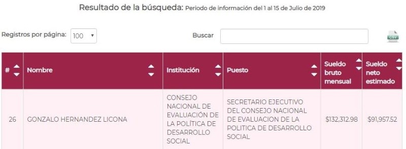 El Presidente Andrés Manuel López Obrador afirmó que el exsecretario ejecutivo del Consejo Nacional de Evaluación de la Política de Desarrollo Social (Coneval), Gonzalo Hernández Licona, tenía un salario de 220 mil pesos al mes.Tras revisar el estado del hospital rural de Zongolica, el Presidente sostuvo que él se bajó el sueldo a 108 mil pesos mensuales y esa decisión no les gustó a muchos funcionarios, que ganaban más."Estoy ganando 108 mil pesos al mes. ¿Cuánto ganaba el que estaba de director del Coneval? 220 mil pesos al mes. Por eso están molestos, pero ni un paso atrás", afirmó.El Mandatario no especificó cuándo ganaba ese monto. Sin embargo, según los datos más recientes del portal de Nómina Transparente de la Administración Pública Federal, Gonzalo Hernández Licona tenía un sueldo neto estimado mensual de 91 mil 957.52 pesos.El pasado 22 de julio se anunció la salida de Hernández Licona del organismo, en el que estuvo por casi 14 años.Durante su evento, el Presidente preguntó en una votación a mano alzada a los asistentes quién conocía la función del Coneval. La gran mayoría levantó la mando porque no conocían qué ese se consejo y sus funciones.Y criticó que ese consejo fue creado solo para simular que atendían la pobreza."El Coneval está en un edificio moderno, no conocen las comunidades y tan es así que las comunidades no los conocen a ellos", aseveró.También sostuvo que el que no contribuya a la transformación de México, el que está a favor del inmovilismo, de mantener el estatus quo, es conservador, se dedique a la política o se dedique al periodismo.Con información de SUNIM