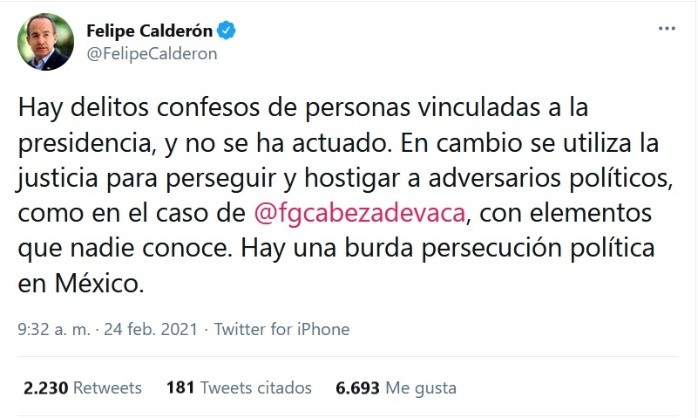El expresidente, Felipe Calderón, aseguró que "hay una burda persecución política en México" tras las acusaciones que derivaron en el inicio del proceso de desafuero al gobernador de Tamaulipas, Francisco Javier Cabeza de Vaca."Hay delitos confesos de personas vinculadas a la presidencia, y no se ha actuado. En cambio se utiliza la justicia para perseguir y hostigar a adversarios políticos, como en el caso de @fgcabezadevaca", dijo Calderón a través de redes sociales.García Cabeza de Vaca, quien es panista, está acusado de una posible comisión de los delitos de delincuencia organizada, operación de recursos de procedencia ilícita y defraudación fiscal equiparada.Según investigaciones, hace unos meses particulares presentaron una denuncia por enriquecimiento ilícito por más de 951 millones de pesos, y derivado de esa denuncia, la Unidad de Inteligencia Financiera (UIF) y el MP integraron la carpeta de investigación y pudieron acreditar que entre abril y diciembre de 2019 se realizaron triangulaciones financieras que le reportaron ingresos por 42 millones de pesos de una empresa fachada que no cuenta con empleados, capital ni antecedentes de declaraciones fiscales, denominada TC12.Esta empresa habría recibido los recursos a su vez de la firma RC, cuyos socios son declarados como sospechosos de operaciones de procedencia ilícita en Estados Unidos.JM