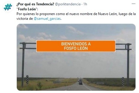 "Fosfo León" se hizo tendencia en las redes sociales luego de que usuarios bromearan que el estado de Nuevo León cambiaría de nombre una vez que Samuel García sea oficialmente el gobernador del estado.La palabra "Fosfo" se hizo viral después de que la esposa del emecista, Mariana Rodríguez, lo ignorara en un video.Un video se viralizó y se ve al virtual gobernador hablar sobre los lugares que iban a visitar como parte de su campaña. Al momento de preguntarle a Mariana, ésta lo ignora y presume sus tenis "fosfo, fosfo".Cibernautas compartieron decenas de memes de la victoria de Samuel García y muchos criticaron que su esposa fue la imagen de su campaña.Samuel García Sepúlveda, virtual triunfador en las elecciones por el gobierno de Nuevo León, celebró la noche de ayer con más de 50 mil asistentes en la Macroplaza de Monterrey, así lo expresó en su cuenta de Twitter."Me comprometo a que a Nuevo León le vaya bien, porque si al nuevo gobierno le va bien, le irá bien a Nuevo León. La campaña ya se acabó y todos debemos ponernos a trabajar. Para los próximos seis años los necesitamos a todos, nos necesitamos todos y todas".jb