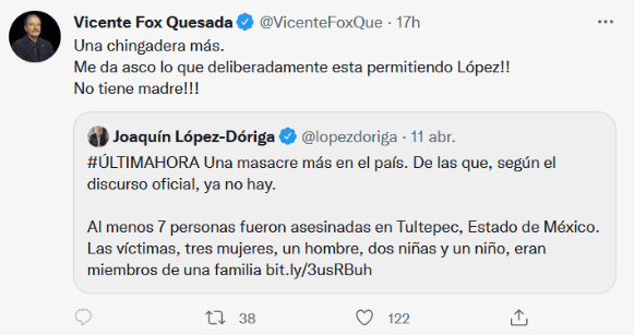 Luego de la masacre que se registró en el municipio de Tultepec, en el Estado de México, donde murieron ocho personas, entre ellas cuatro menores de edad, el expresidente Vicente Fox estalló en contra de Andrés Manuel López Obrador (AMLO).A través de redes sociales, Fox criticó duramente a AMLO por el multihomicidio que se registró ayer lunes: "Una chingadera más. Me da asco lo que deliberadamente esta permitiendo López!! No tiene madre!!!".Sin embargo no fue el único mensaje crítico, pues en los últimos días Fox ha expresado su enojo por distintas situaciones que ocurren actualmente en el país, como la construcción del Aeropuerto Felipe Ángeles, o el fracaso de la Guardia Nacional. "Ya no sabemos si son cohetes o balas", dijeron pobladores luego del ataque directo que terminó con ocho integrantes de una familia, tres mujeres, cuatro niños y un hombre, quienes fueron asesinados dentro de su casa cuando dormían. Todos tenían impactos de bala en la cabeza.Vecinos de La Cañada, sobre todo de la cerrada Mazahua, escucharon detonaciones la noche del domingo. Otros oyeron gritos y pidieron el apoyo de la policía municipal y de ambulancias.En el sitio quedaron los cuerpos, en pijama, de los nietos y las hijas de doña Rosa, así como de su yerno, al que presuntamente buscaban los atacantes, en lo que se presume como un ajuste de cuentas, pues en la casa no hubo indicios de robo, confirmaron autoridades mexiquenses.Entre las víctimas estaba doña Rosa, quien falleció horas más tarde en el hospital Vicente Villada en Cuautitlán; dos hijas y cuatro nietos, tres de ellas niñas, así como su yerno de no más de 30 años.Una de las madres fallecidas trató de cubrir con el cuerpo a su pequeña, pero las huellas del ataque denotan que los homicidas mataron una a una a cada víctima, incluido un bebé de no más de dos años, quien quedó muerto sobre su cama. Los agentes que ingresaron a la vivienda encontraron los casquillos de tres diferentes armas: nueve de calibre .40 automática; 14 de calibre .380, y siete de una 9 milímetros.La Fiscalía General de Justicia del Estado de México (FGJEM) informó que inició una investigación por este homicidio múltiple e informaron que analizan si hay cámaras en la zona para tratar de ubicar a los atacantes.Los agentes buscaron aparatos de vigilancia en las casas de la zona o en la calle, pero no encontraron ninguna. La más cercana se ubica a 300 metros.GC